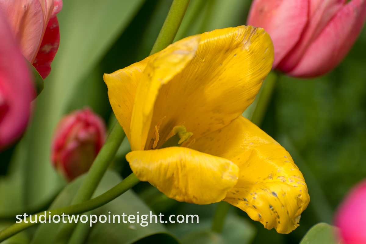 This Studio 2.8 photography photograph presents a fading yellow tulip blossom. Like many blossoms it seems, this had grown at the angle, as though knowingly reaching directly for the morning sun each day. There is a closer perspective of this blossom available at the following link. This spring tulip blossom photograph was captured on April 12, 2019. There seem to be just a few days available from the day the tulip blossoms first appear, until the blossoms begin to decay and lose their luster.
