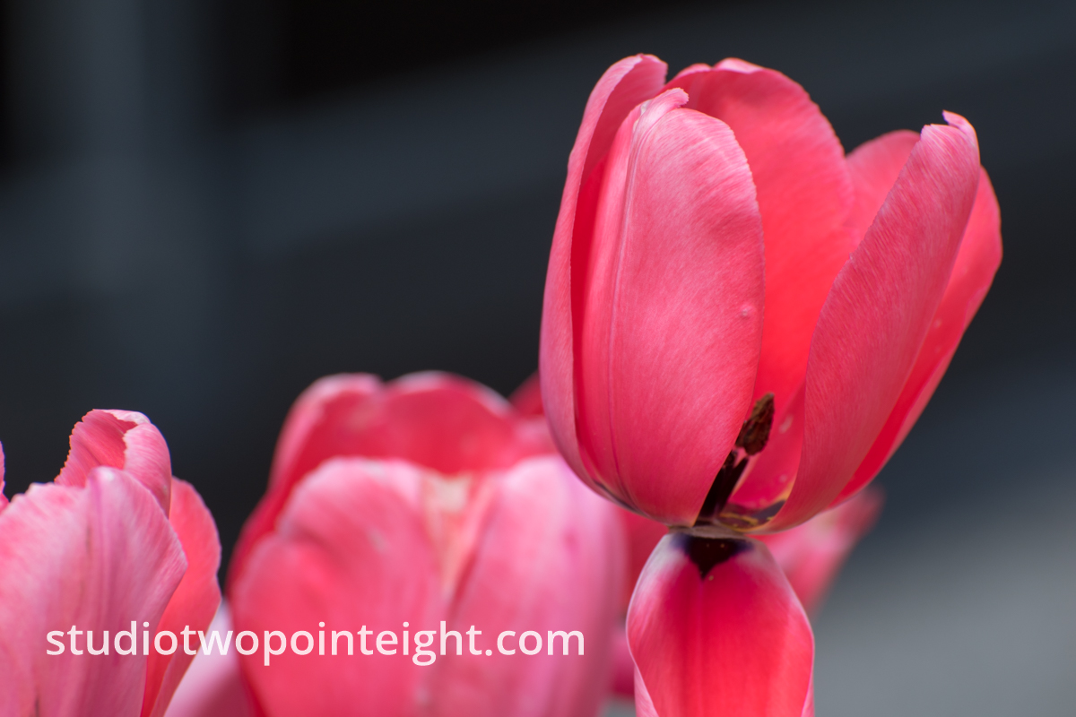 In this photograph, a warm red tulip was nestled among additional warm red tulips behind it. The landscape presentation photograph's depth of field doesn't quite lose the background tulips into bokeh. This spring tulip blossom photograph was captured on April 9, 2019. There seem to be just a few days available from the day the tulip blossoms first appear, until the blossoms begin to decay and lose their lustre.