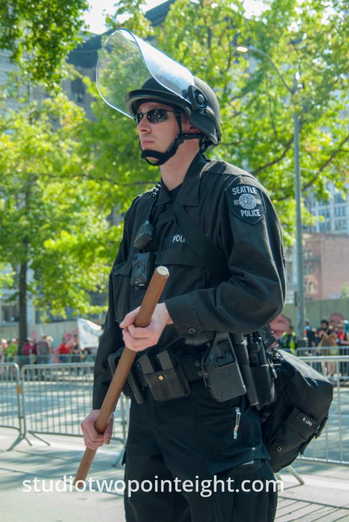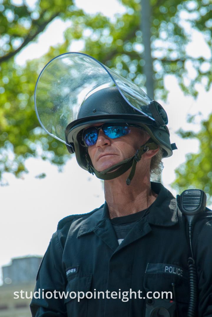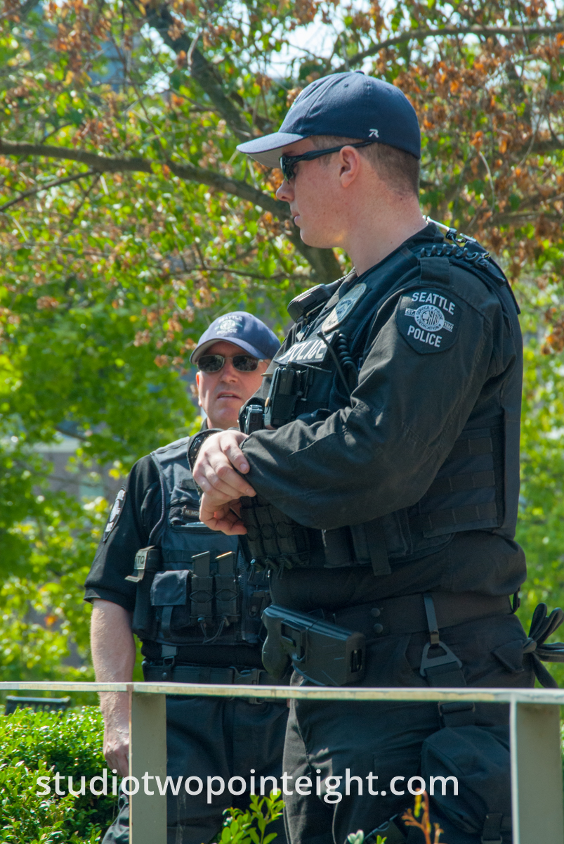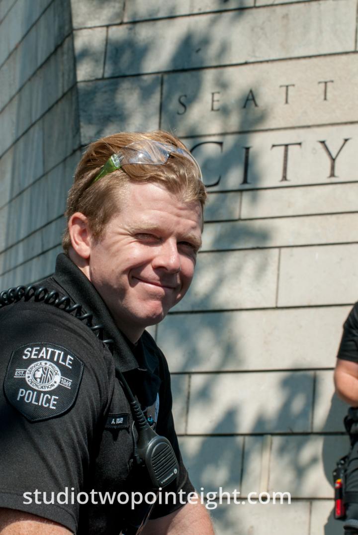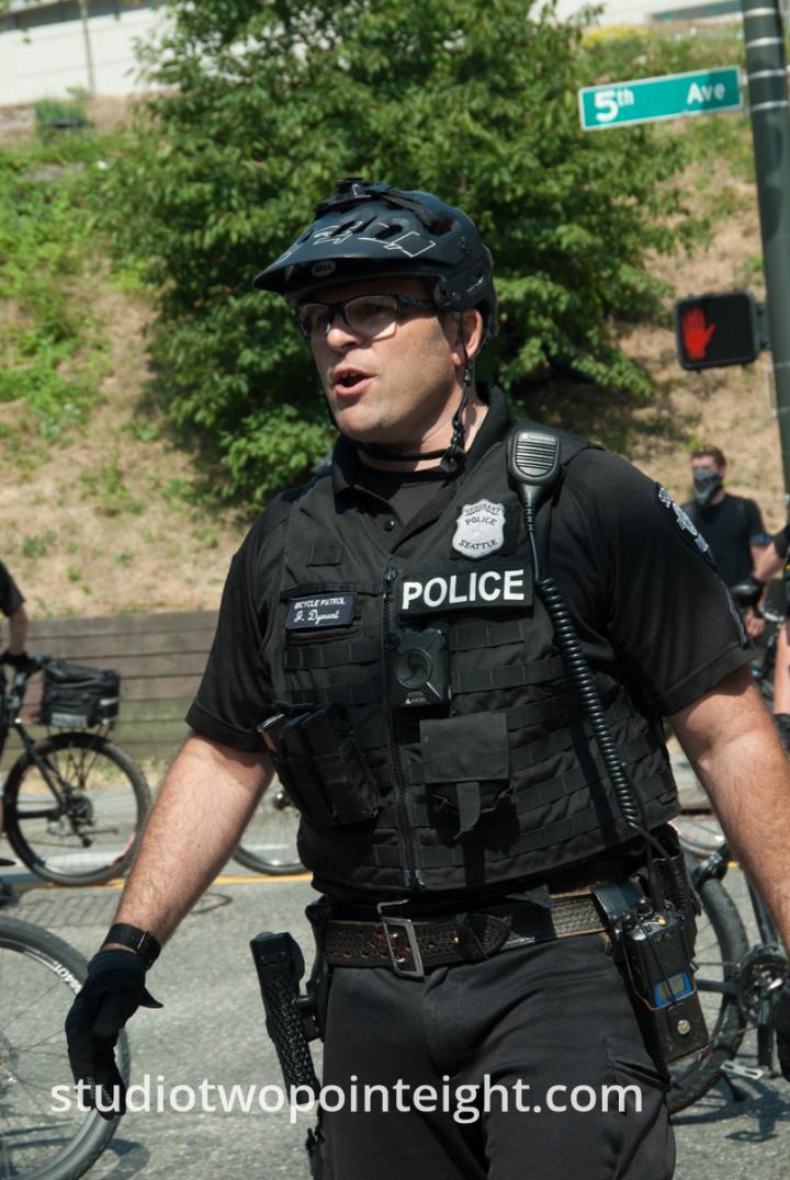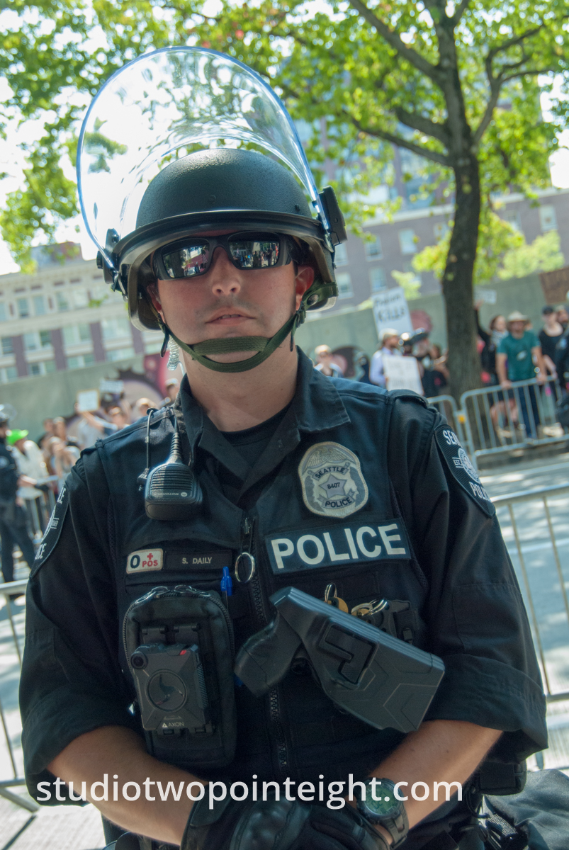 In downtown Seattle, on Saturday August 18, 2018, at the Liberty or Death rally sponsored by the political organization Washington Three Percent, hundreds of police officers attended the scene. There were officers from the Seattle Police Department, the Redmond Police Department, the King County Sheriff's department, and more. The officers on duty included Seattle Police bicycle patrol Sergeant James Dyment. It seems like most of the work that the Seattle Police had to, involved policing the counter protestors, many of whom were associates of the communist/socialist/anarchist Antifa Black Bloc domestic terror group. As the these photographs also demonstrate, most of the officers who stood watch over the rally demonstrators who had a permit to demonstrate on the Seattle City Hall courtyard spent their days mostly just watching and smiling.
