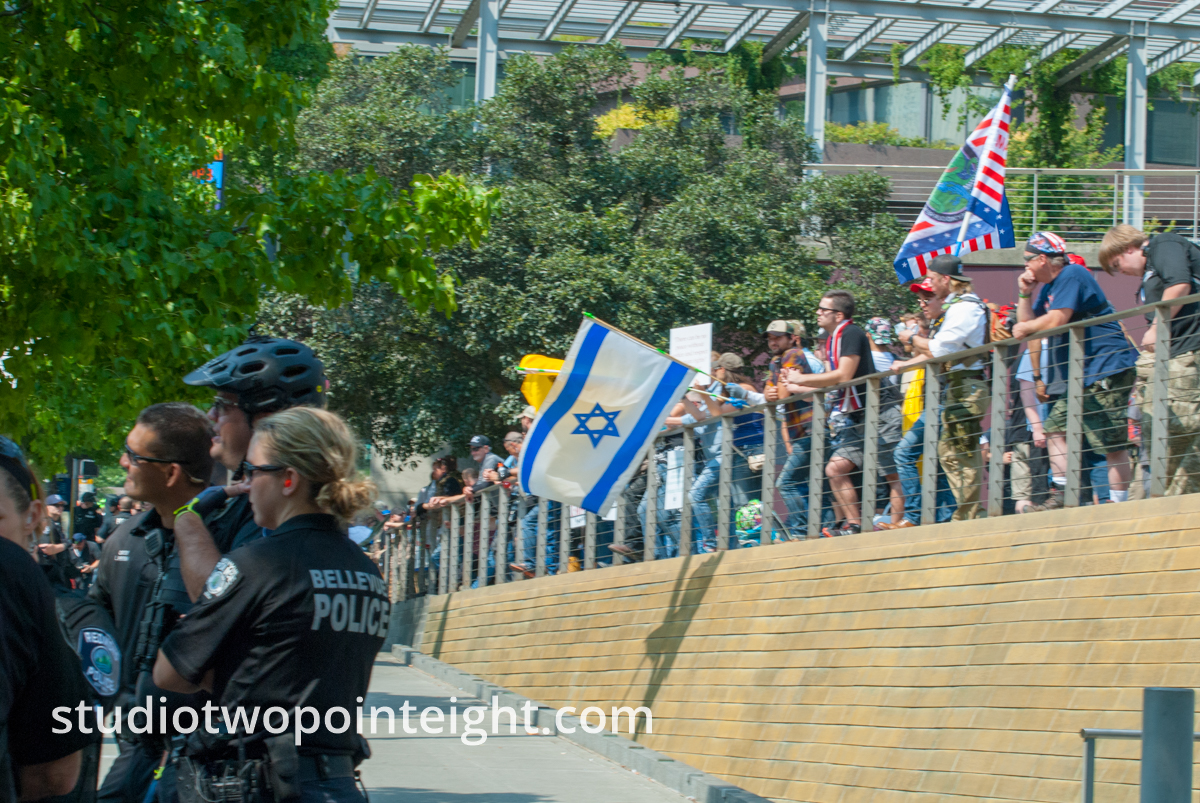Jewish attendees of the August 18, 2018 Liberty or Death Rally in Seattle flew a very large Israeli flag while counter protesters across the street ignorantly called them "Nazis", "KKK", and "Fascists".