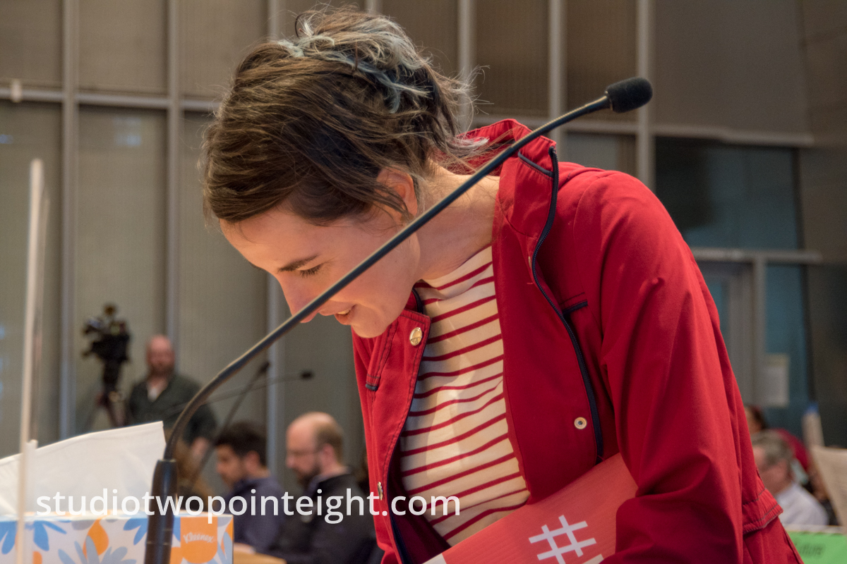 In this photograph, a woman wearing a red jacket signed up to testify before the council about the council's "Mandatory Housing Affordability" ordinance. This woman was one of many Seattle Residents who signed up to testify before the Seattle City Council on Monday March 18, 2019.
