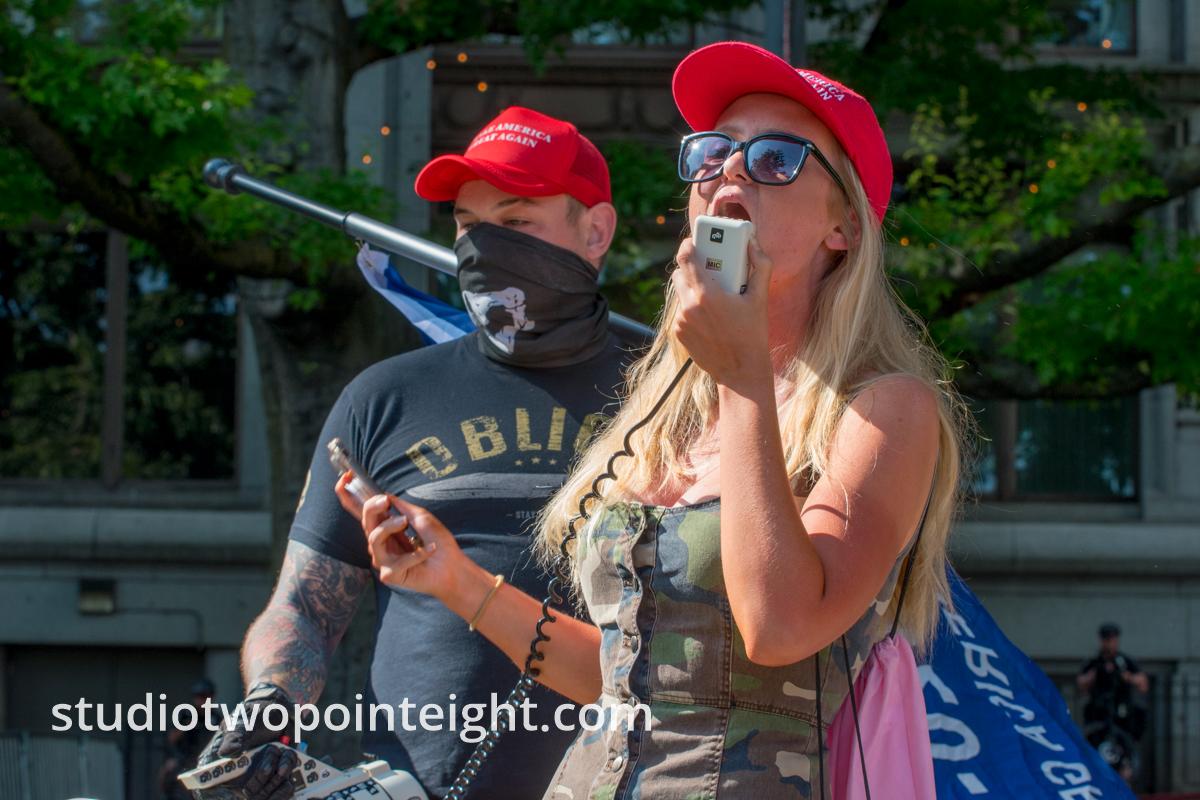 In this Studio 2.8 photograph from Sunday July 14, 2019 at a political rally in Seattle, Washington called "Unite Against Political Violence", one of the speakers expressed her political views. The woman in this photograph wore a red "Make America Great Again" hat, along with a "romper" style outfit, as she held a cell phone that apparently contained her speaking notes, as she spoke to the crowd with an amplified bullhorn.