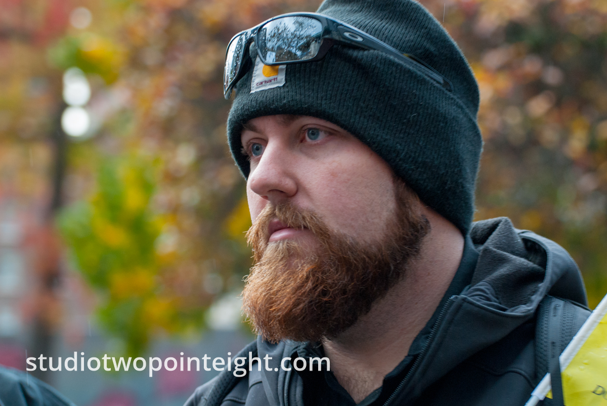 In this photograph from the December 1, 2018 "Liberty or Death 2" rally against media bias held in Seattle by the Washington Three Percent, and attendee listened to one of the many speakers at the event.