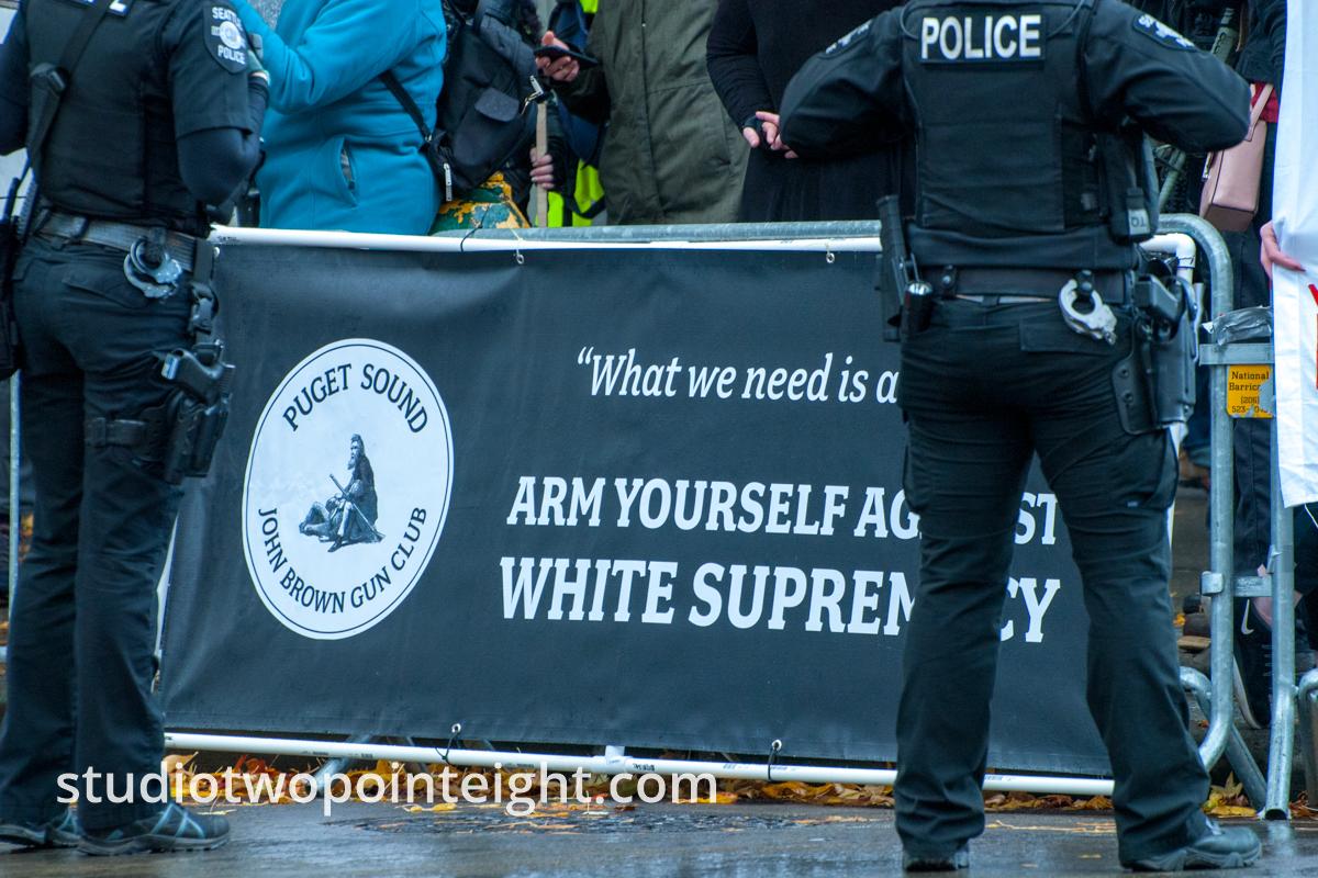 One of the slogans on the "Puget Sound John Brown Gun Club" banner stated, "Arm Yourself Against White Supremacy". Another slogan on the "Puget Sound John Brown Gun Club" banner stated, "what we need is action".