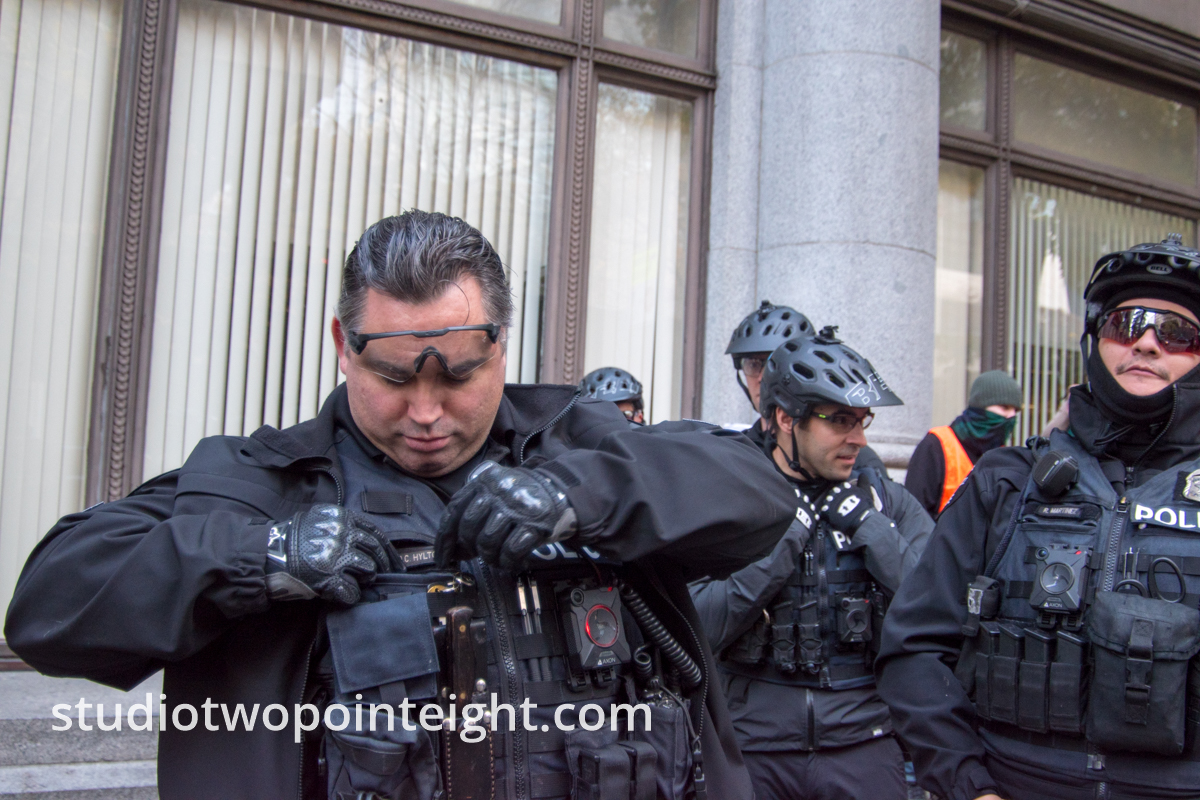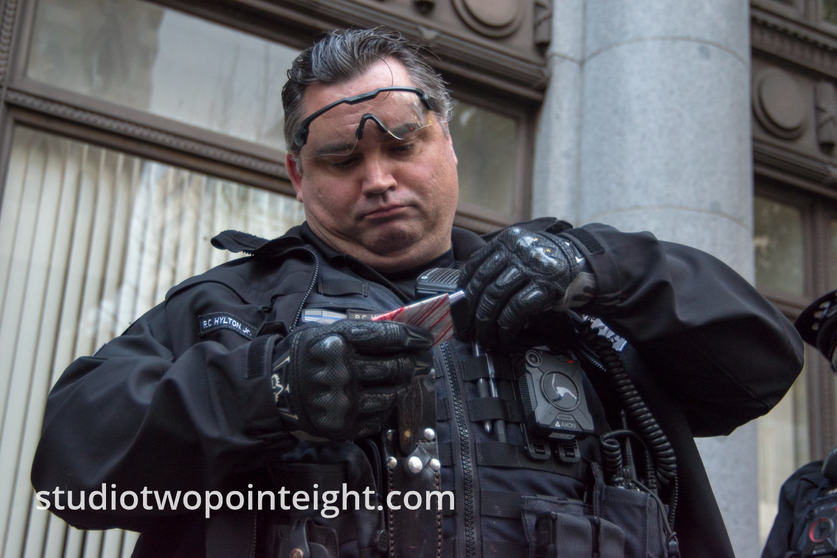 In this photograph is Seattle Police Department Sergeant Hylton providing his business card after he communicated that his Lieutenant had declared the Antifa and Black Bloc counter protesters too dangerous, that they were "a threat to public safety", and that therefore he couldn't allow media to enter their area to photograph. There had already been an incident within the area when photojournalist Andy Ngo had entered and an infamous Antifa counter protester named Jamal Williams had indirectly threatened that Andy Ngo was going to be killed. Andy Ngo has published his video of Jamal Williams threatening him. Sergeant Hylton then ordered his officers, who had previously been facing the Antifa counter protesters to form an outward facing barricade and not let anyone pass. Regardless, it was possible to obtain valuable and documentary photographs of the Marxist / Communist / Antifa / Black Bloc / Anarchist counter protesters from the perimeter.