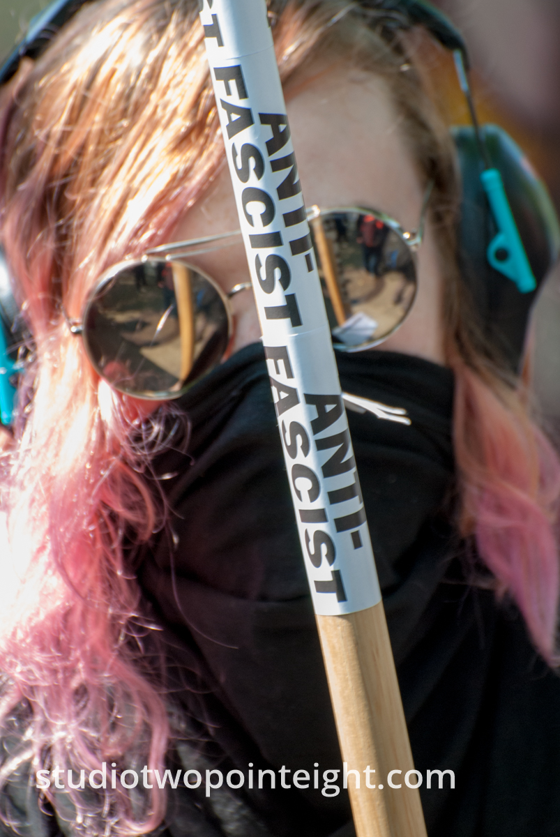 At the Liberty or Death rally in downtown Seattle, on Saturday August 18, 2018 by the political group Washington Three Percent, this counter protesting woman carried a stick labelled "Anti-Fascist", which she held up closely in front of her face. The woman and her stick struck an interesting political chord. This young woman with the "Anti-Fascist" labelled stick kept tugging at the bandanna she was using to cover her face. The question repeatedly arose while photographing these masked people - why did she believe she needed to hide her face? What is the implication in the U.S., where people supposedly have a constitutional right to free speech, that some people who seem to want to say they are "anti-fascist" appear afraid to openly take that political stance, as they hide behind masks while publicly espousing it?
