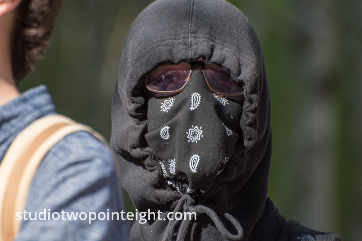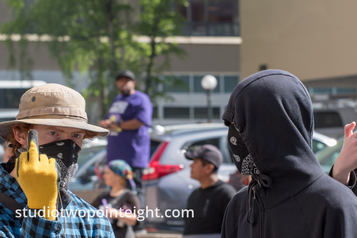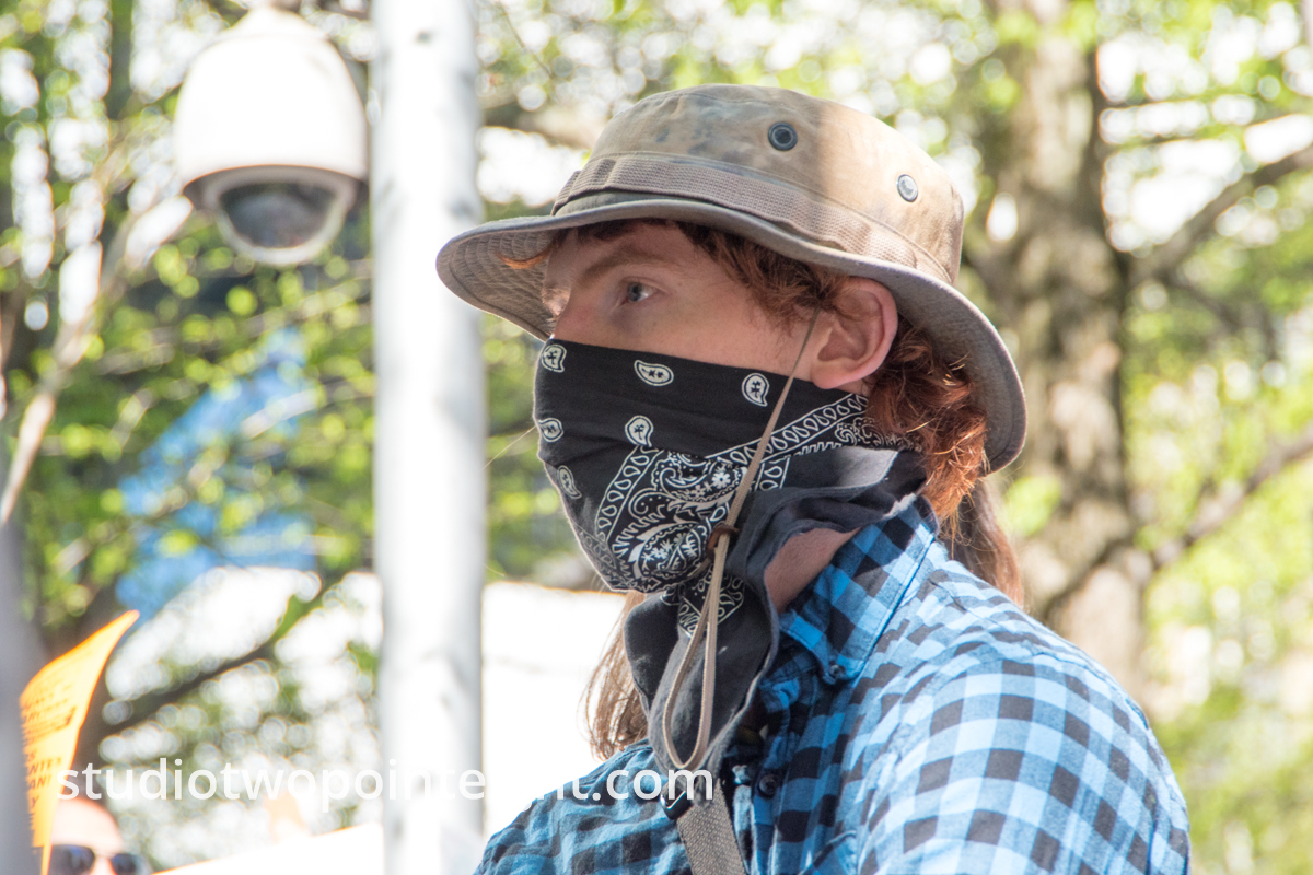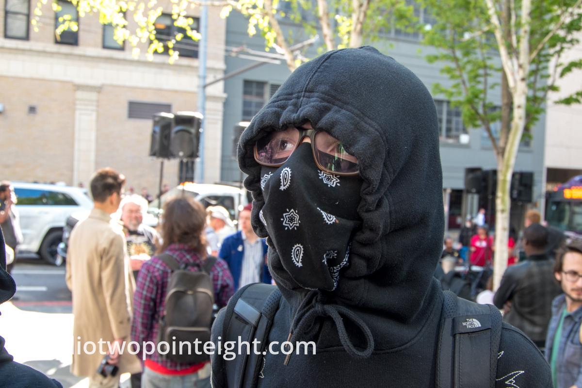In this gallery of wide aspect ratio photographs taken on May 1, 2019 during the Immigration Politics Rally in Seattle, a tiny contingent of Marxist Communist Antifa Black Bloc domestic terrorists were present infiltrating the immigration and worker rights politics event. The Antifa Black Bloc is a domestic terror cell network well known for violent antics where ever and whenever they are present. The BlackBloc terrorists are known for wearing all black clothing that includes masks and other attempts to disguise themselves. The Marxist Communist BlackBloc espouses what has been described by some as "Anarcho Communist" political beliefs. The Antifa Black Bloc terrorists espouse politics that are an alt-left extremist version of radical violent revolution based Marxist Communism. The banners and posters displayed by the Antifa, so called "Anarchist" Black Bloc contains slogans such as "Anti-State" and "Anti-Capitalist" to describe their violent, seditious revolution based Marxist Communism. The photographs of the few Antifa Black Bloc domestic terrorists in this gallery illustrate the generally immature, if not infantile, behavior and antics the Black Bloc demonstrates as they act out with tantrums at political events. Ironically, one of the Antifa Black Bloc terrorists present on May 1, 2019 in Seattle didn't appear to have gotten the memo about wearing all black and was instead attired in a navy blue bandanna, canvas colored docker hat, and a blue, white, and black, checked button down shirt, with bright yellow work gloves on his hands. Based on the infantile gestures that the Black Bloc hooligans made with their hands, they tried to act like they didn't like being photographed, despite the fact that they repeatedly made a point of buzzing about and mugging for the camera the entire day.