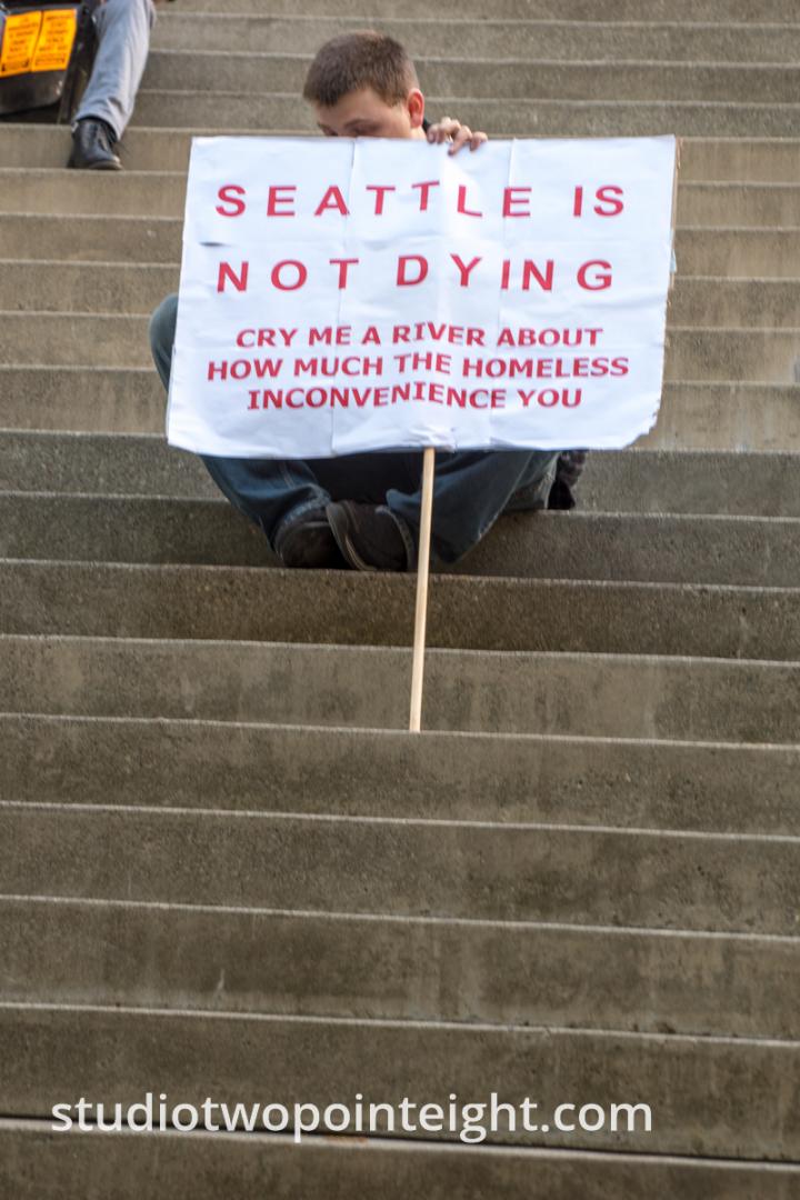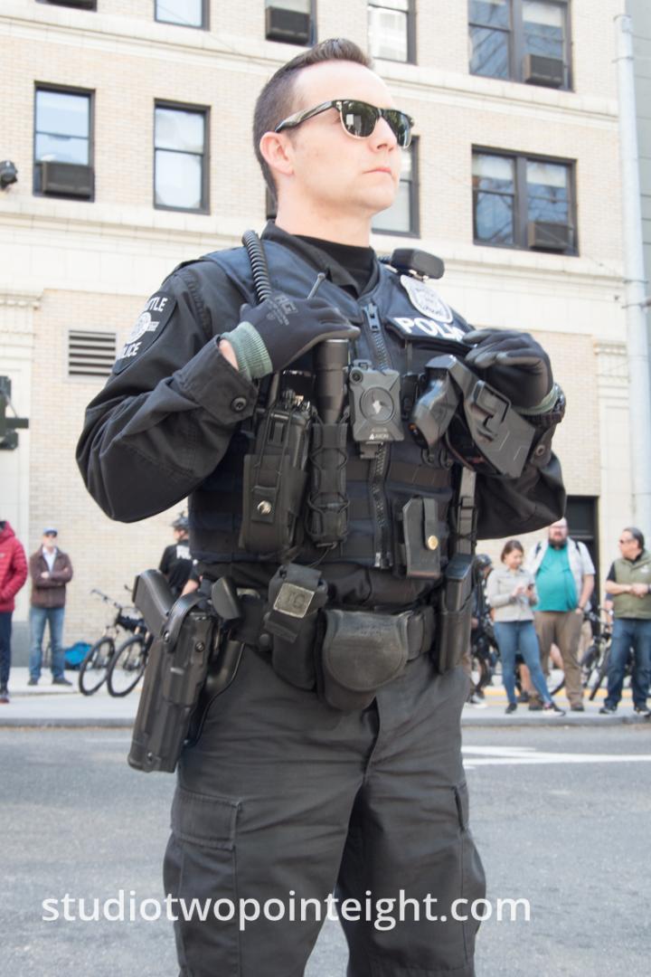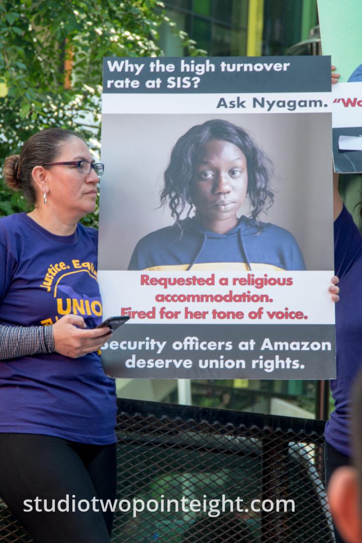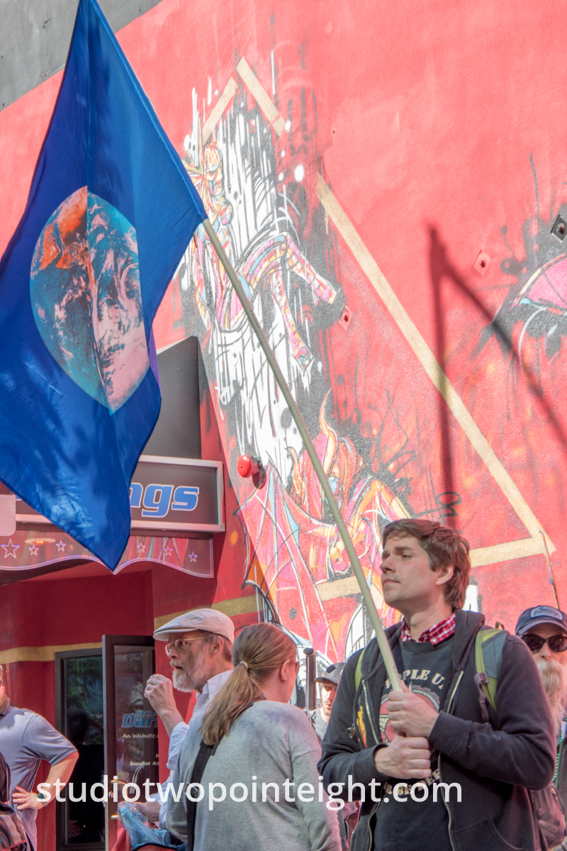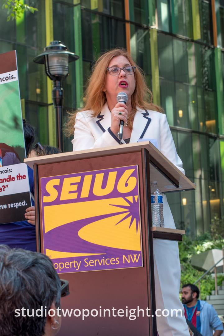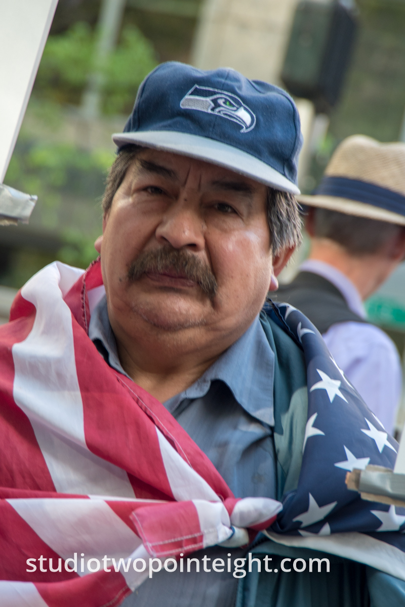 This extensive gallery of tall aspect ration photographs presents a variety of images from the May 1, 2019 U.S. Immigration Policy March and Rally held in Seattle, Washington on that day. This year's incarnation of the annual May Day immigration politics march and rally included a march along Seattle streets from Judkin's Park in south Seattle through parts of Seattle's Capitol Hill neighborhood, and then through parts of Seattle's downtown business core. The March concluded with two different sets of speeches, the first made in front of amazon.com headquarters and the second set of speeches made from a portable stage setup in front of the federal courthouse at 7th Avenue and Stewart Street. The immigration policy march and rally paused in front the amazon.com headquarters on 7th Avenue, where various speakers, including Seattle City Council member Lisa Herbold expressed their perspectives and concerns about the working conditions of employees of companies who contract with amazon.com to provide various types of services to amazon.com, such as security. The march portion of the immigration politics rally was led through the streets by the well known Aztec traditional dancing troop Ceatl Tonalli, whose dancers wear brightly colored traditional Aztec costumes as they conduct formal group dancing to the beat of a drum team. The photographs in this gallery are presented primarily in chronological order.