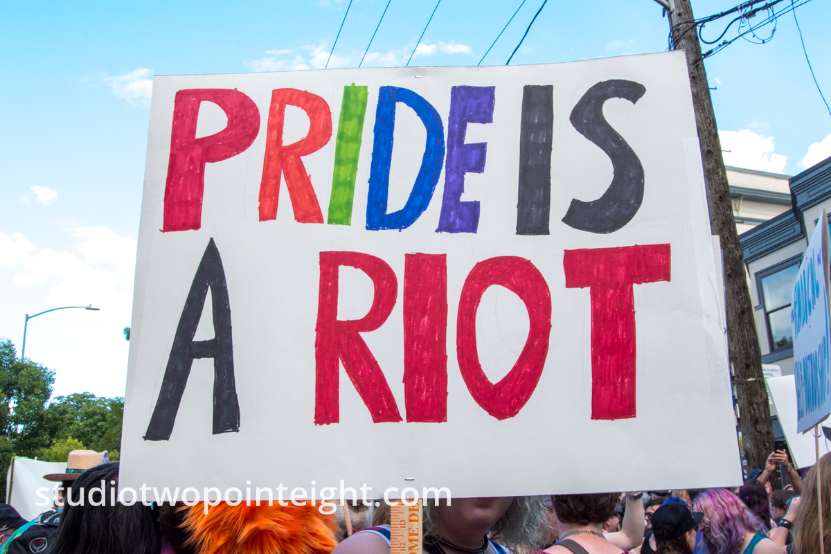 In this Studio 2.8 photograph from Seattle Trans Pride on June 28, 2019, an attendee held aloft a poster on a yard stick with the slogan "Pride Is A Riot" on it, in homage to the June 28, 1969 Stonewall Riots in New York City. This Studio 2.8 photograph was produced on the evening of June 28, 2019 just before the 2019 Seattle Trans Pride march and rally. The Seattle Trans Pride 2019 march and rally was held in the Capitol Hill neighborhood of Seattle, Washington.
