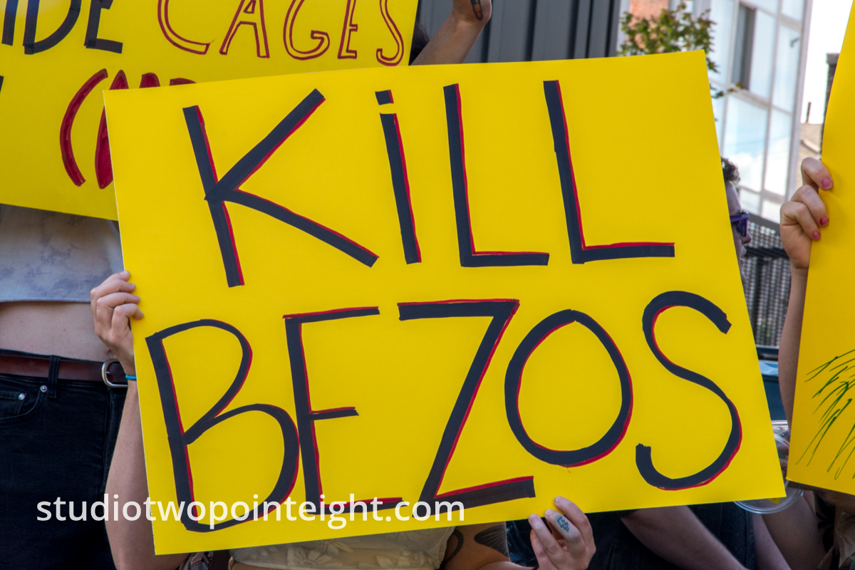 In this Studio 2.8 photograph from the Seattle Trans Pride 2019 march and rally, held on Friday June 28, 2019, in Seattle's Capitol Hill neighborhood, one of several attendees who carried political posters held aloft a large yellow background poster with phrase "kill bezos" on it.