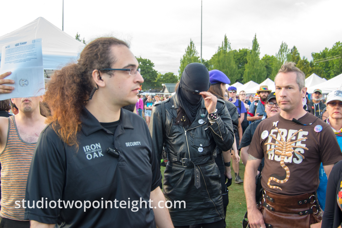 Moments before this Studio 2.8 photograph was captured on the evening of June 28, 2019 at Seattle's Cal Anderson Park, a large civilian vigilante hate mob had begun to assemble and criminally accost, menace, assault, and batter, the Studio 2.8 photographer who produced this photograph. The Anarcho-Communist "Antifa Black Bloc" domestic terror criminal in this photograph verbally blustered and taunted the Studio 2.8 photographer who produced this photograph with the idle boasts: