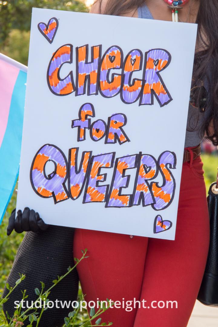 In this pair of Studio 2.8 photographs produced on the evening of June 28, 2019, at the 2019 Seattle Trans Pride march and rally, before its march portion in Seattle's Capitol Hill neighborhood, the two women in this photograph displayed a poster with the slogan "Cheer for Queers" on it. The two women in this Studio 2.8 photograph appeared quite happy and quite proud to communicate their message, "Cheer for Queers". In this June 28, 2019 Studio 2.8 photograph the two women in it wore colorful clothing with rainbow pride colors and rainbow jewelry and accessories.