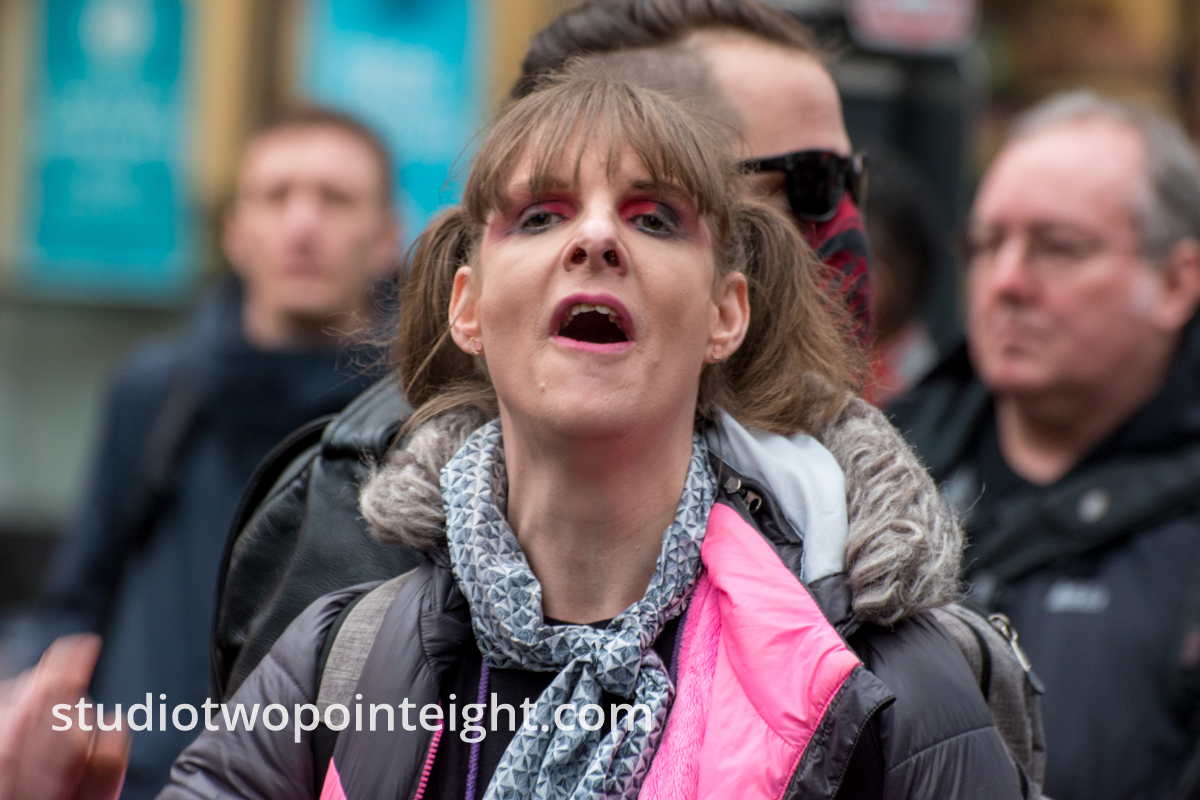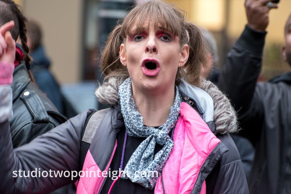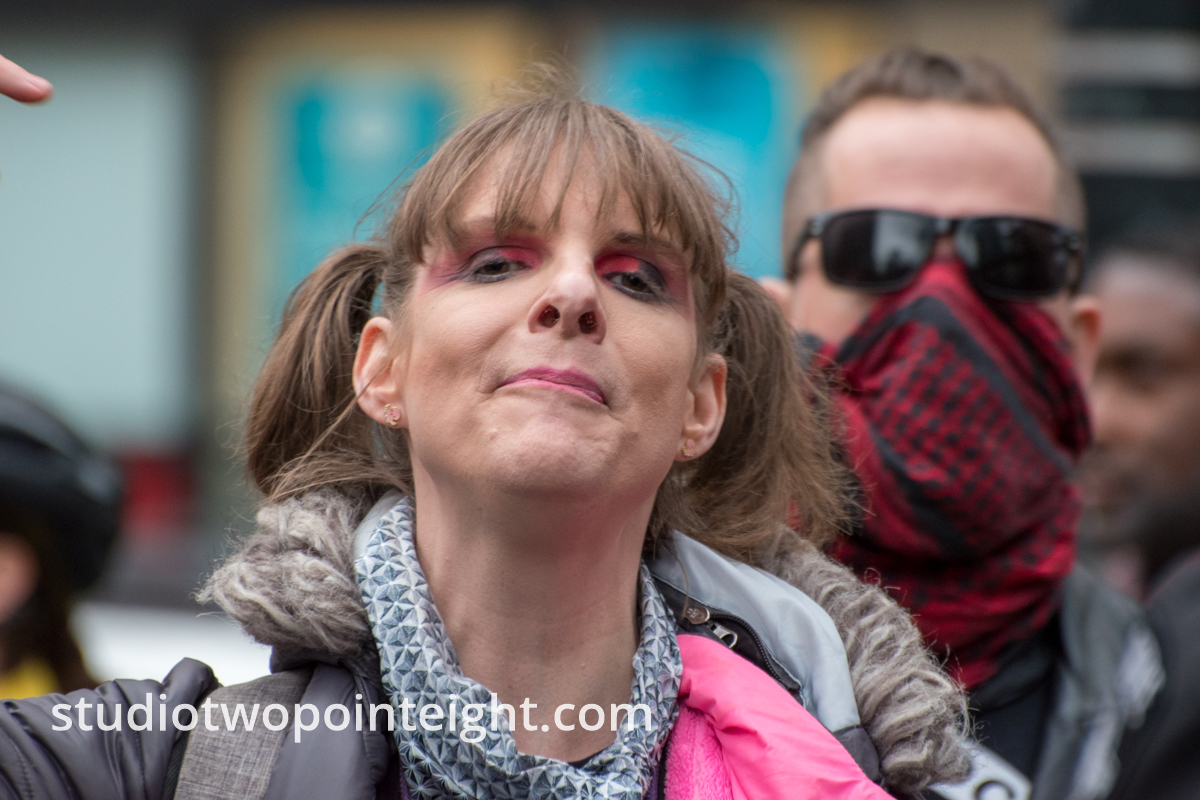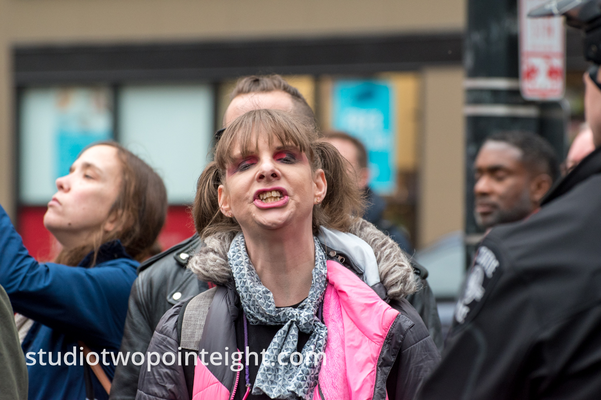 In this Studio 2.8 photography photo series, produced on Saturday December 7, 2019, during a Pearl Harbor Day commemoration event at Seattle's McGraw Square, the pictured anarcho-communist counter-protester shouted and ranted loudly. The counter-protester in this series of Studio 2.8 photographs, with accompanying high definition video below, wore a pink themed outfit that included garish, pink themed, heavy facial makeup. The pink attired anarchist counter-protester ranted that "... Donald Trump is supporting genocide of people who died ...". As the anarchist counter-protester in the pink themed attire continued to shout and gesticulate, members of the Seattle Police crowd control squadron suddenly began to use their bicycles to push the group of counter-protesters that included the protester in pink backward. In response, the pink attired counter-protester began to focus on shouting angrily at the police. The Studio 2.8 GoPro shoulder-cam video view presented below provides political perspective and insight into the visual, auditory, and physical, context during which these photographs were produced.