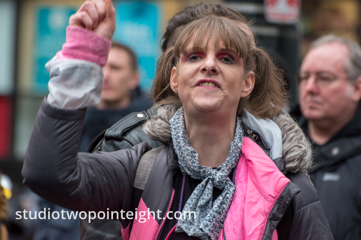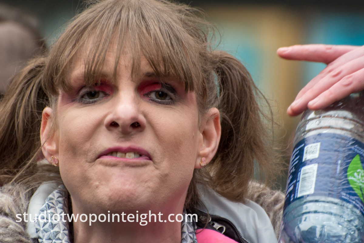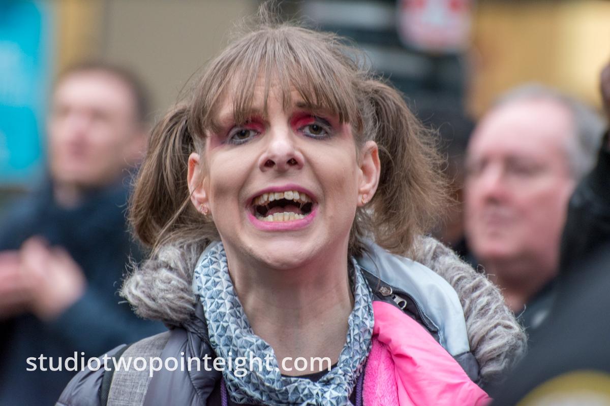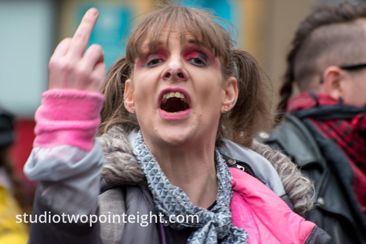 In this Studio 2.8 photography photo series, produced on Saturday December 7, 2019, during a Pearl Harbor Day commemoration event at Seattle's McGraw Square, the pictured anarcho-communist counter-protester shouted and ranted loudly. The counter-protester in this series of Studio 2.8 photographs, with accompanying high definition video below, wore a pink themed outfit that included garish, pink themed, heavy facial makeup. The pink attired anarchist counter-protester ranted that "... Donald Trump is supporting genocide of people who died ...". As the anarchist counter-protester in the pink themed attire continued to shout and gesticulate, members of the Seattle Police crowd control squadron suddenly began to use their bicycles to push the group of counter-protesters that included the protester in pink backward. In response, the pink attired counter-protester began to focus on shouting angrily at the police. The Studio 2.8 GoPro shoulder-cam video view presented below provides political perspective and insight into the visual, auditory, and physical, context during which these photographs were produced.
