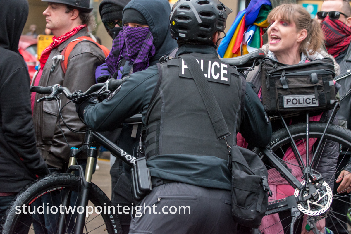 The Studio 2.8 photography photographs in the gallery series above, were produced from a distance, using a telephoto lens, a distance of likely thirty or forty feet from the subject of these photographs. As the subject of these Studio 2.8 photographs shouted numerous Seattle Police officers formed a phalanx of bicycles to keep the communist counter-protests away from the Republicans who had obtained a permit from the City of Seattle to hold a Pearl Harbor Day commemoration event. Later during the event, the counter-protester in the photo series above danced and cavorted wildly as a pair of "Black Bloc" masked anarcho-communist terrorists burned a "blue lives matter", "thin blue line" flag, and then tore its remains to shreds as a large group of Seattle Police crowd control officers stood and watched them.