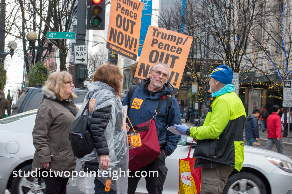 Notably, around the Seattle area, the Revolutionary Communist Party rarely discloses their actual identity when in public around the Puget Sound region, primarily in public when they counter-protest at political events organized and held by other political groups. Instead, the Revolutionary Communist Party uses the cover website and cover moniker "refusefascism.org" to identify itself on their often large orange and black banners, on poster's the group's members carry, and on the orange and black sticker the organization's members often where on their sleeves and elsewhere on their clothing, as are visible in this Studio 2.8 photography exclusive photograph.