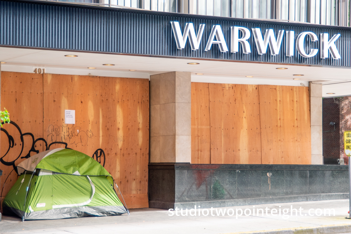 The Studio 2.8 photography, 2020 corona virus pandemic documentary, photograph above was produced in Seattle, WA during the month of May 2020, outside the Warwick Hotel, a boutique hotel in downtown Seattle, Washington. The Studio 2.8 photography service is documenting in detail the variety of impacts the 2020 COVID-19 corona virus pandemic has had throughout the American Pacific Northwest, with both extensive photography and in-depth video. In this Studio 2.8 2020 virus pandemic documentary photograph from May 2020, someone without a house during the pandemic, has pitched a tent to live protected from the rain, beneath the awing of the close and boarded up Warwick Hotel. The person living in a tent shown in this Studio 2.8 photography photograph is just one of hundreds of similar tents observed around Seattle by the Studio 2.8 photography team while documenting the various impacts of the coronavirus panic and crisis, impacts anyone and everyone can observe throughout the American Pacific Northwest region, throughout the U.S., and around the world.