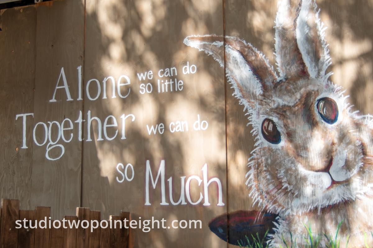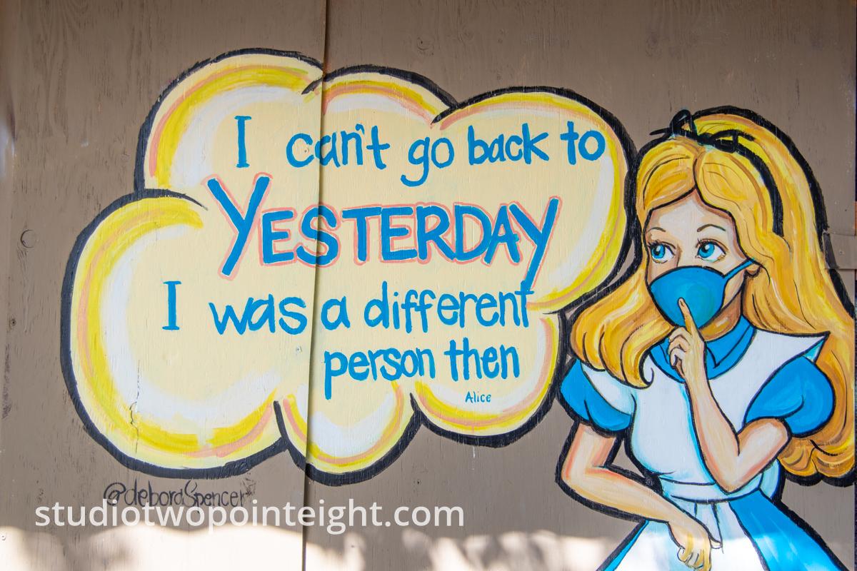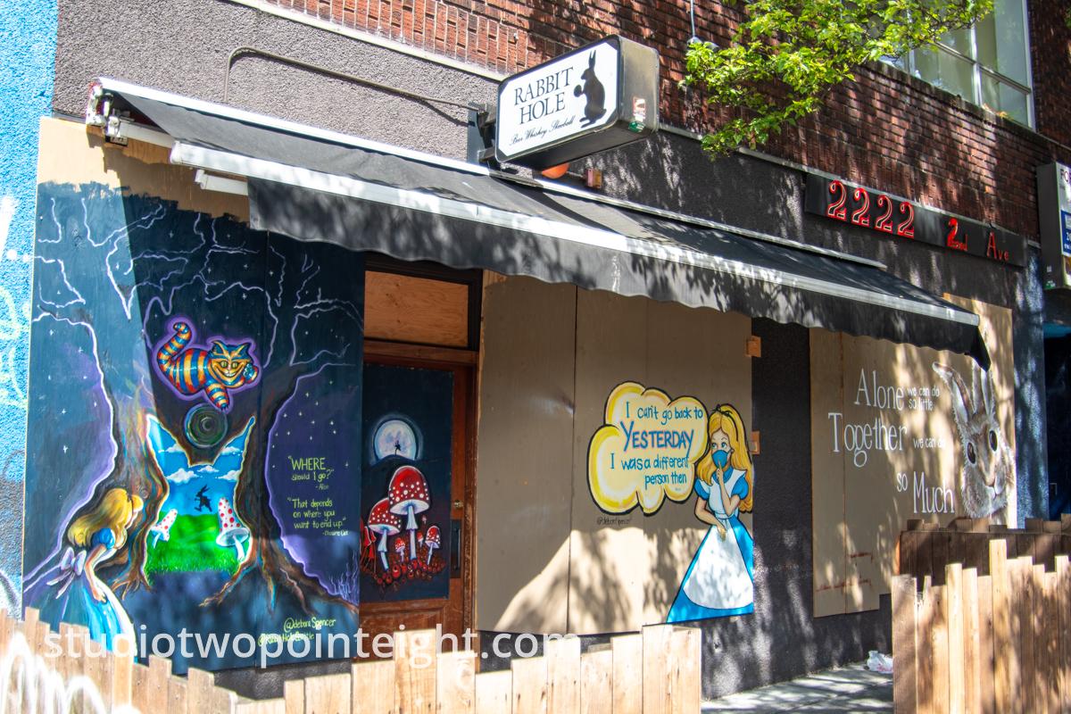 This gallery of Studio 2.8 photography 2020 corona virus pandemic documentary photographs, created outside the Rabbit Hole bar in Seattle was produced in downtown Seattle, WA during May 2020 in the midst of the global coronavirus pandemic panic and crisis. The Studio 2.8 photography service is documenting the 2020 COVID-19 coronavirus pandemic in detail with both photographs and with video (in production). In this Studio 2.8 2020 virus pandemic documentary photograph from May 2020, the Rabbit Hole bar, in Seattle's Belltown neighborhood, was closed and its windows were covered with painted plywood. The plywood covering the Rabbit Hole storefront windows had been painted over with Alice in Wonderland artwork, fitting the theme of nightclub, which prevented the closed and boarded up establishment from looking like an eyesore. Located at 2222 Second Avenue in the Belltown neighborhood of Seattle, it still isn't apparent if and/or when businesses like the Rabbit Hole will re-open or return to their previous manner of doing business.