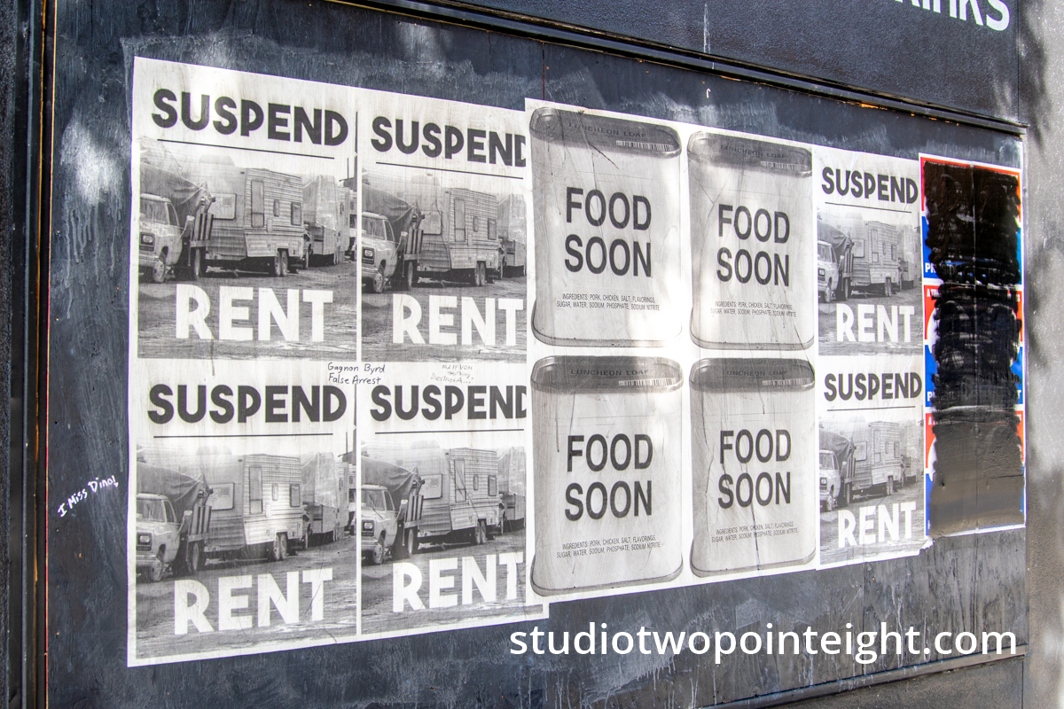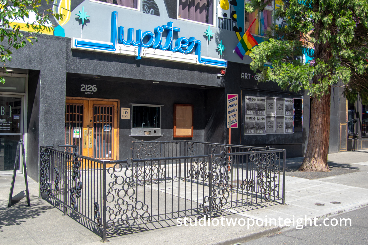 In this Studio 2.8 2020 virus pandemic documentary photo gallery from May 2020, the Jupiter bar, in Seattle's Belltown neighborhood, was closed and its windows were covered with painted plywood. The plywood on the Jupiter Bar storefront windows had been covered with pasted on placards that contained such phrases as "SUSPEND RENT" and "FOOD SOON" on them. Located at 2126 Second Avenue in the Belltown neighborhood of Seattle, it remains unclear if and/or when businesses such as the Jupiter Bar will re-open or return to their previous manner of doing business.