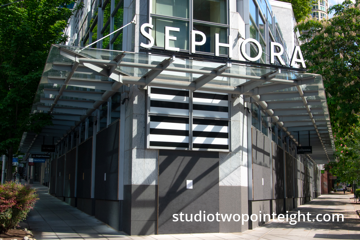 Studio 2.8 Documenting The 2020 Corona Virus Pandemic, South lake Union Sephora Store, Closed And Boarded Up