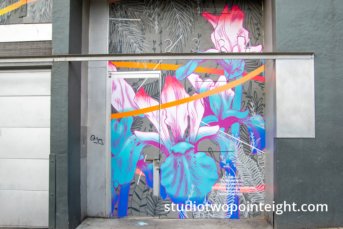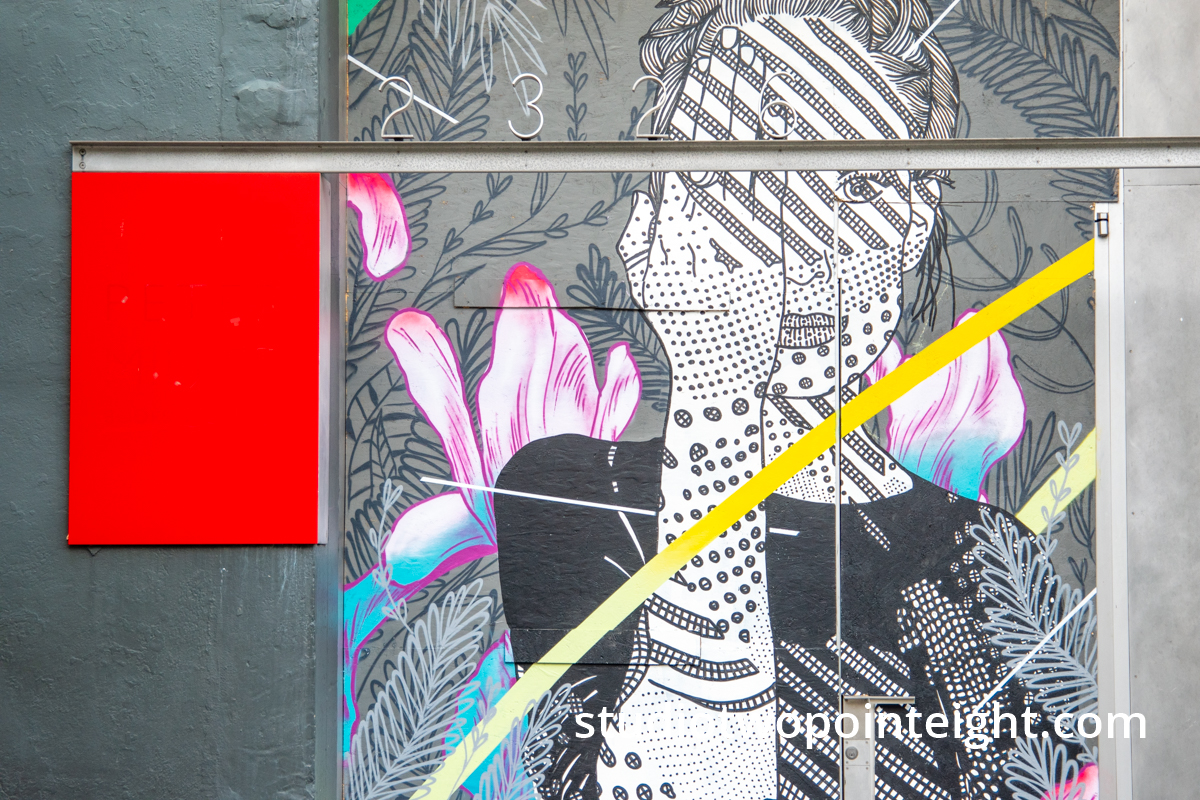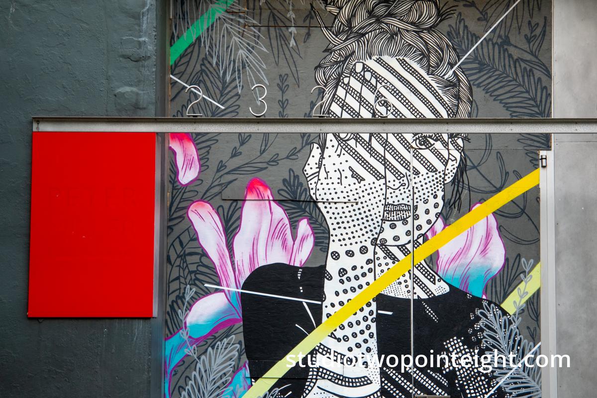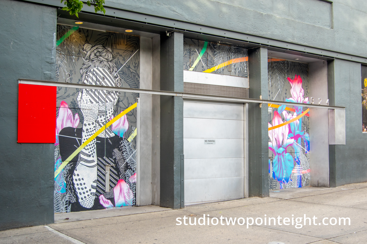 This Studio 2.8 photography 2020 corona virus pandemic documentary photograph created outside the Vue Lounge in Seattle was produced in downtown Seattle, WA during May 2020. The Studio 2.8 photography service is documenting the 2020 COVID-19 corona virus pandemic in painstaking detail with both extensive photographs and video. In this Studio 2.8 2020 virus pandemic documentary photograph from May 2020, the Vue Loungenight club in Seattle was closed and its windows were covered with plywood. The plywood covering the Vue Lounge nightclub storefront windows had been painted over with superb artwork that prevented the closed and boarded up night club from looking like an eyesore. Located at 2326 Second Avenue in the Belltown neighborhood of Seattle, it still isn't apparent if and/or when businesses like this one will re-open or return to their previous manner of doing business. Until just two years ago, this building, this location, had for over twenty years been the offices of architect and builder George Suyama.