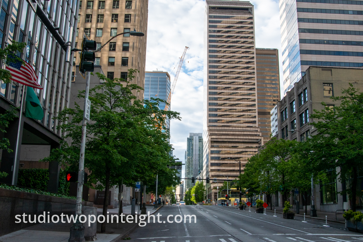 This Studio 2.8 photography 2020 corona virus pandemic documentary photograph was produced in downtown Seattle, WA on May 13, 2020. The Studio 2.8 photography service is documenting the COVID-19 corona virus pandemic with detailed photographs and video. In this Studio 2.8 virus pandemic documentary photograph from May 13, 2020, produced during what would normally have been the afternoon rush hour, a main thoroughfare in downtown Seattle, WA, Second Avenue, had very little vehicular traffic on it, and the Second Avenue sidewalks were nearly deserted. The visual perspective in this Studio 2.8 photograph is looking north along Second Avenue in Seattle from the Columbia Street intersection.
