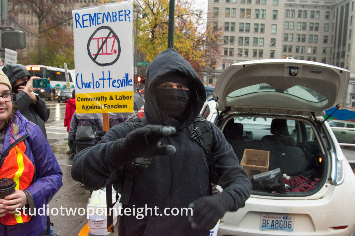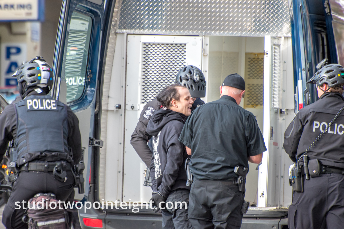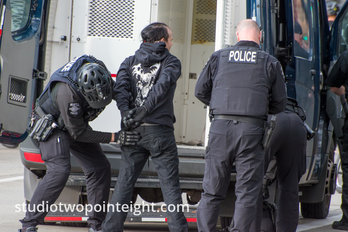 The Studio 2.8 photography photo gallery above, presents several Studio 2.8 exclusive telephoto lens photographs of the infamous antifa "Black Bloc" anarcho-communist domestic terror cell network participant Nicholas Armstrong, as Armstrong was being arrested on a charge of "Reckless Endangerment" (RCW 9A.36.050 - a gross misdemeanor crime), as Armstrong was being prepared for transport to the King County Jail by officers with the Seattle Police Department. This gallery of Studio 2.8 photographs was produced on Sunday January 5, 2020 in downtown Seattle, Washington, near the 4th Avenue and Cherry Street intersection. The set of Studio 2.8 photographs above, which includes photographs that show Nicholas James Armstrong in handcuffs and under arrest by the Seattle Police Department, was produced before and after a political rally held by the Washington Three Percent called "United Against Hate". The fourth photograph in the Studio 2,.8 gallery above presents Nicholas Armstrong (alias "Jaymie Jameson") as Armstrong appeared during the hours before the official rally began, when Armstrong wore communist anarchist all black "Black Bloc" style disguising clothing, while Armstrong and members of various "alt-left" communist extremist groups, such as the Revolutionary Communist Party, picketed in counter-protest on the 4th Avenue sidewalk, across the street from the Washington Three Percent "United Against Hate" rally. The official rally held by the Washington Three Percent, with a permit from the city, was held on the Seattle City Hall courtyard.