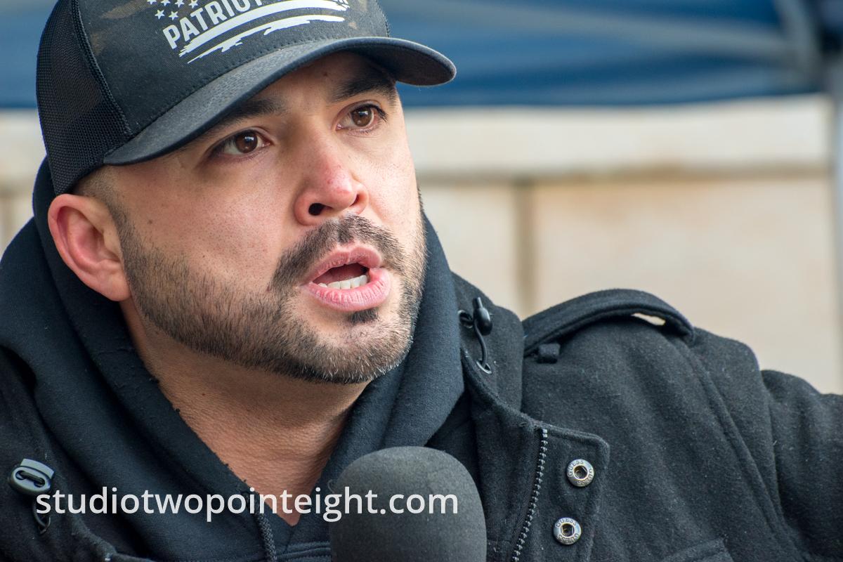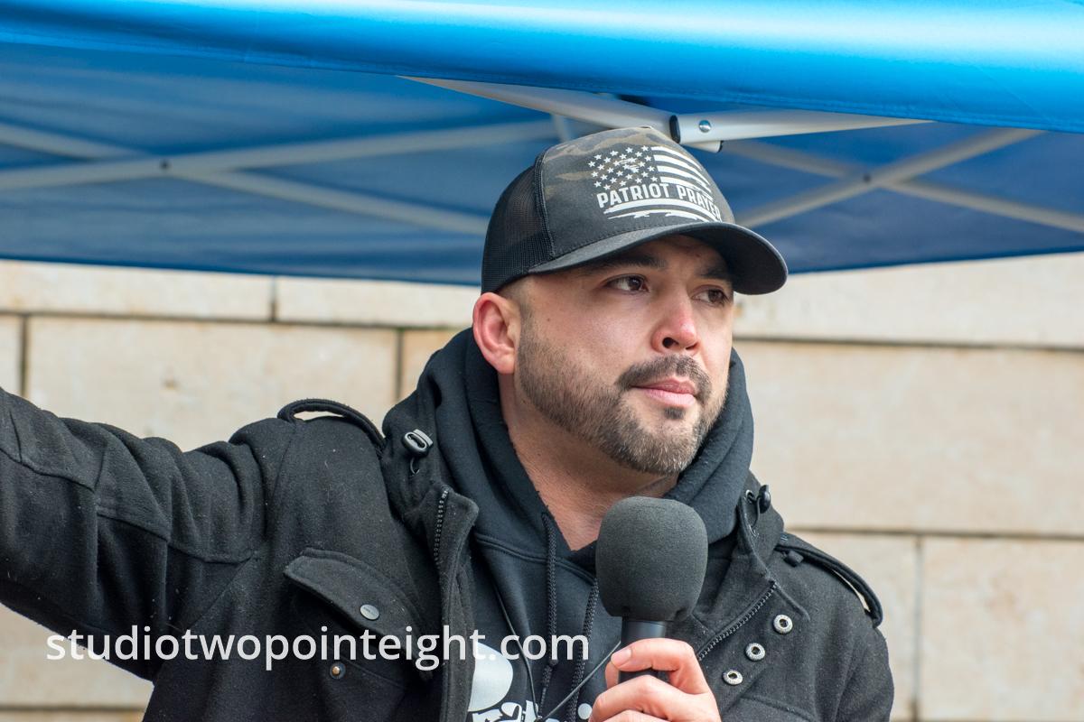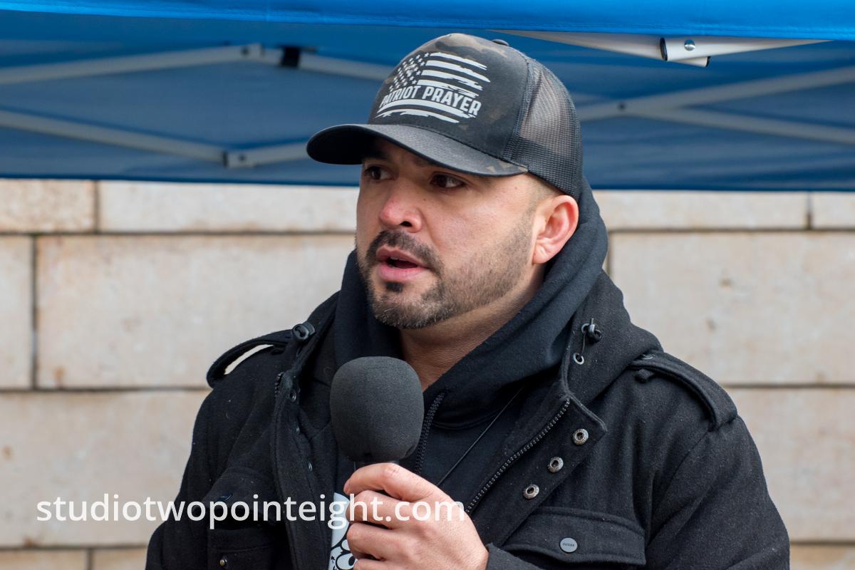 The photos in this Studio 2.8 photography photo gallery were produced in downtown Seattle, Washington on Sunday January 5, 2020 at the Seattle City Hall plaza/courtyard where a non-profit political organization called the Washington Three Percent held a rally with speeches entitled "United Against Hate". In this Studio 2.8 exclusive photo gallery, Washington Republican politician attendee and speaker, and founder of the political group "Patriot Prayer", gave a speech to the crowd gathered for this Sunday event, in opposition to discrimination, in opposition to bigotry, and in opposition to all forms of violence and hate.