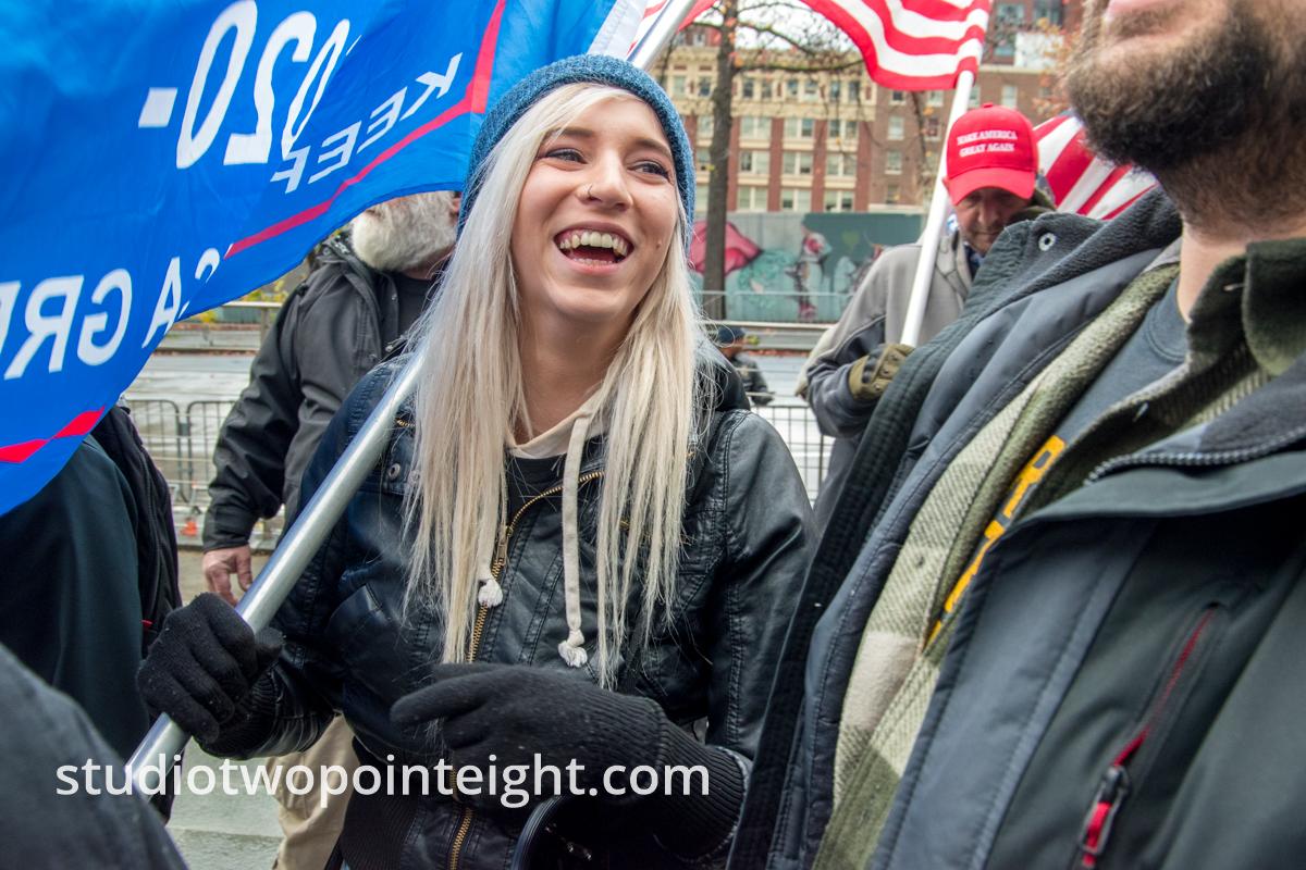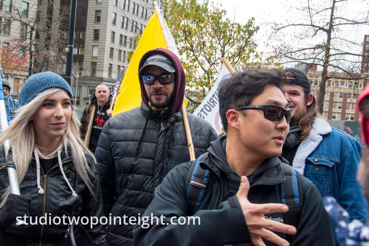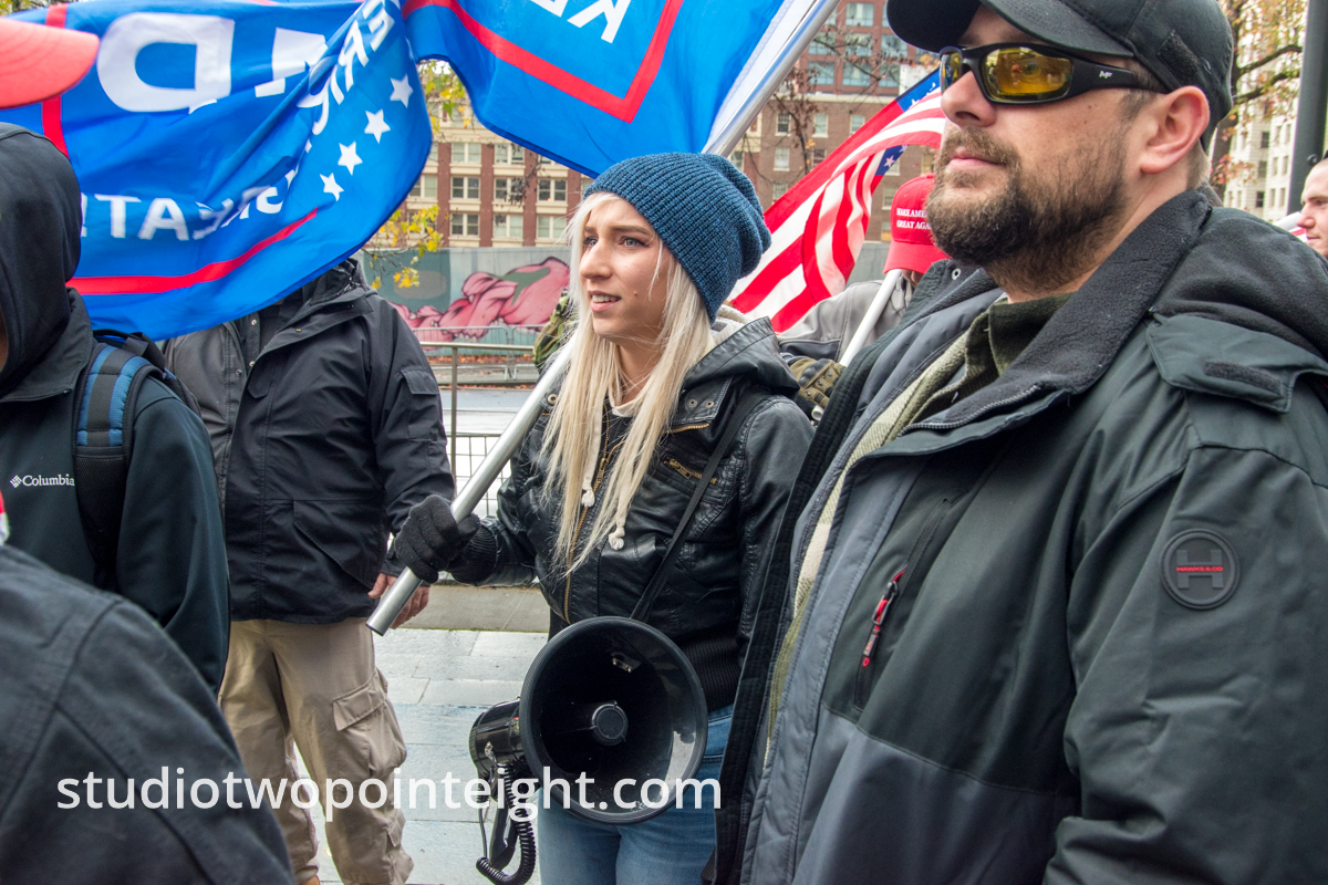 The photos in this Studio 2.8 photography photo gallery were produced in downtown Seattle, Washington on Sunday January 5, 2020 at the Seattle City Hall plaza/courtyard, during a political event held by the non-profit political organization called the Washington Three Percent held a rally with speeches entitled "United Against Hate". In this Studio 2.8 exclusive photo gallery, Portland Mayoral candidate, and other attendees from Portland, Oregon with her, arrived at the rally in the late morning and conversed with other rally attendees as they all waited for the political speeches to begin, which were speeches against bigotry, against discrimination, and against hate and hatred, which began at noon.
