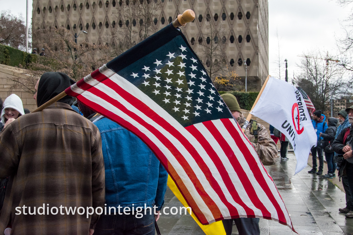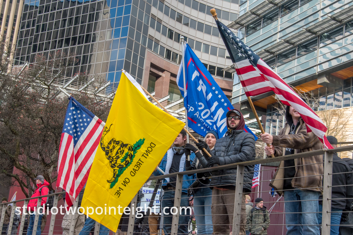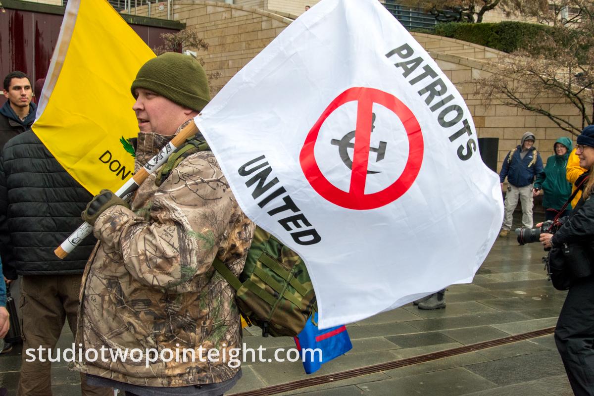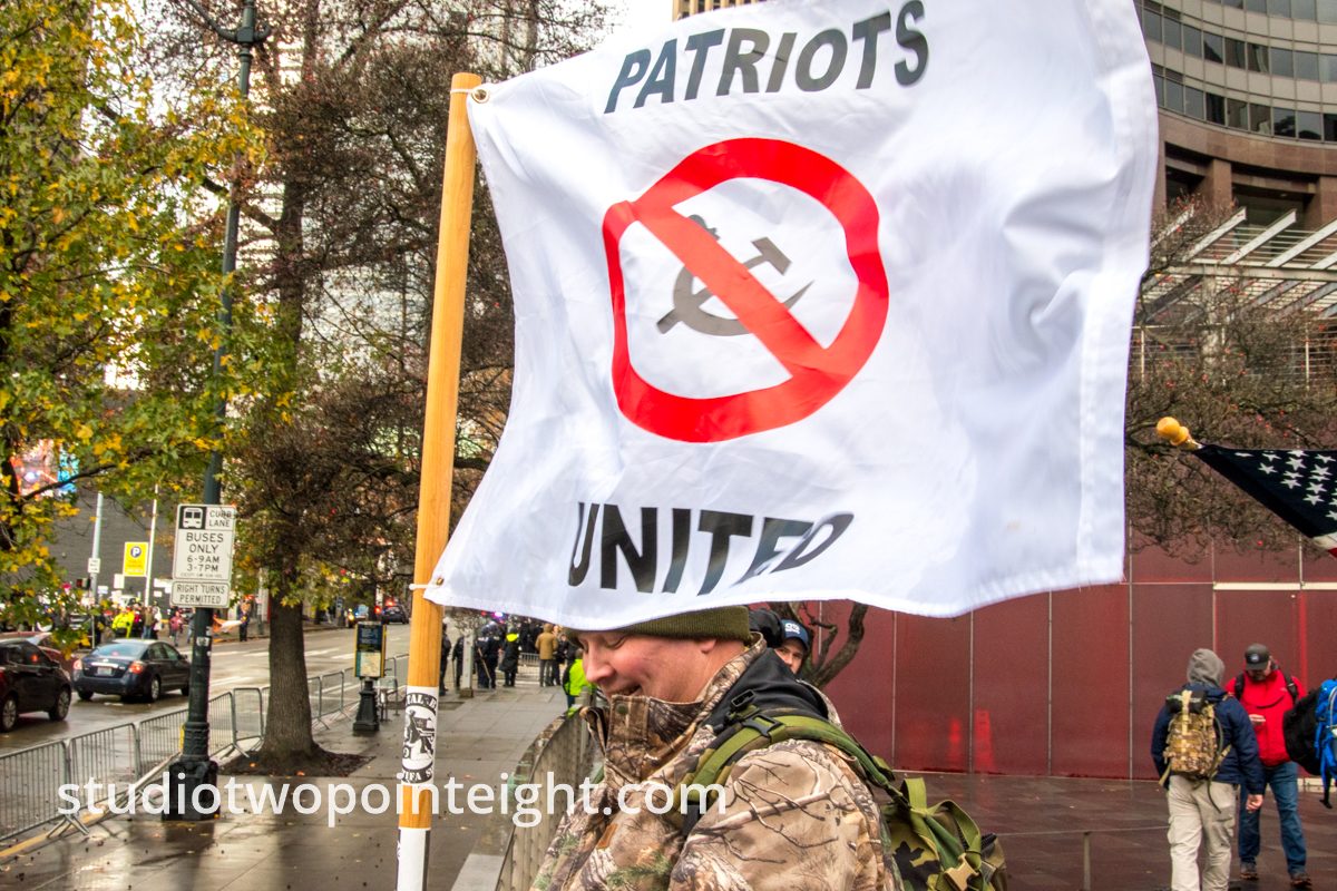 The photos in this Studio 2.8 photography exclusive photo gallery were produced in downtown Seattle, Washington on Sunday January 5, 2020 at the Seattle City Hall plaza/courtyard where a non-profit political organization called the Washington Three Percent held a rally with speeches entitled "United Against Hate". In this Studio 2.8 exclusive photo gallery, rally attendees carried and displayed various types of political, and patriotic, flags. This Studio 2.8 photo gallery contains photographs of attendees who carried: American stars and stripes flags, a "PATRIOTS UNITED Against Communism" flag, a "Don't Tread on Me" gun rights flag, a "Trump 2020" flag, a "We Support Our Troops" flag, and more.