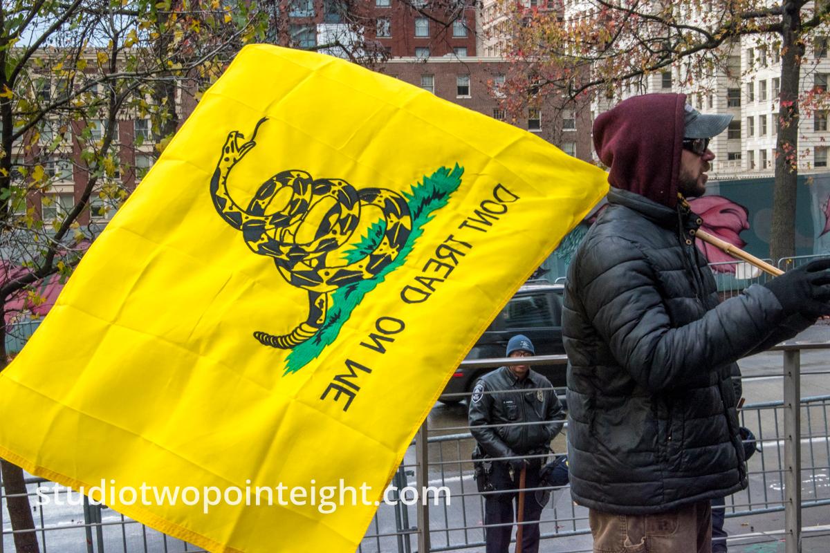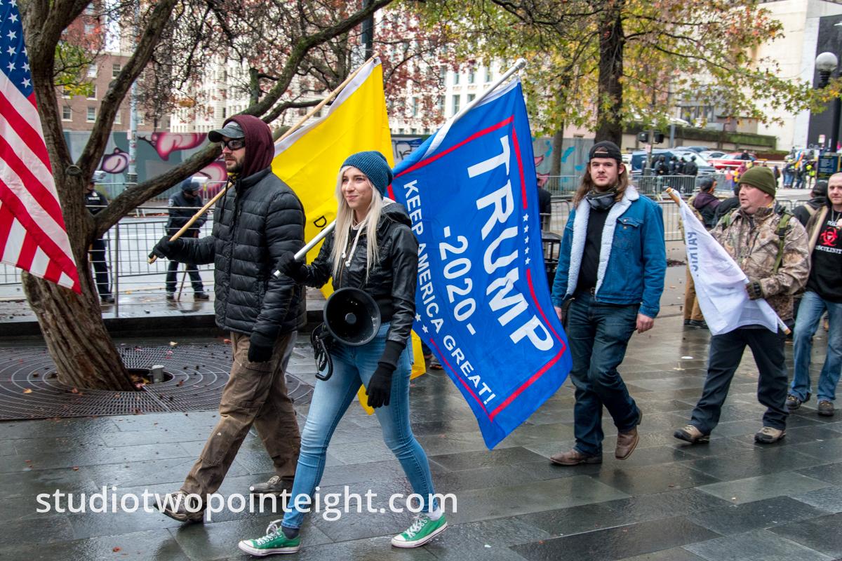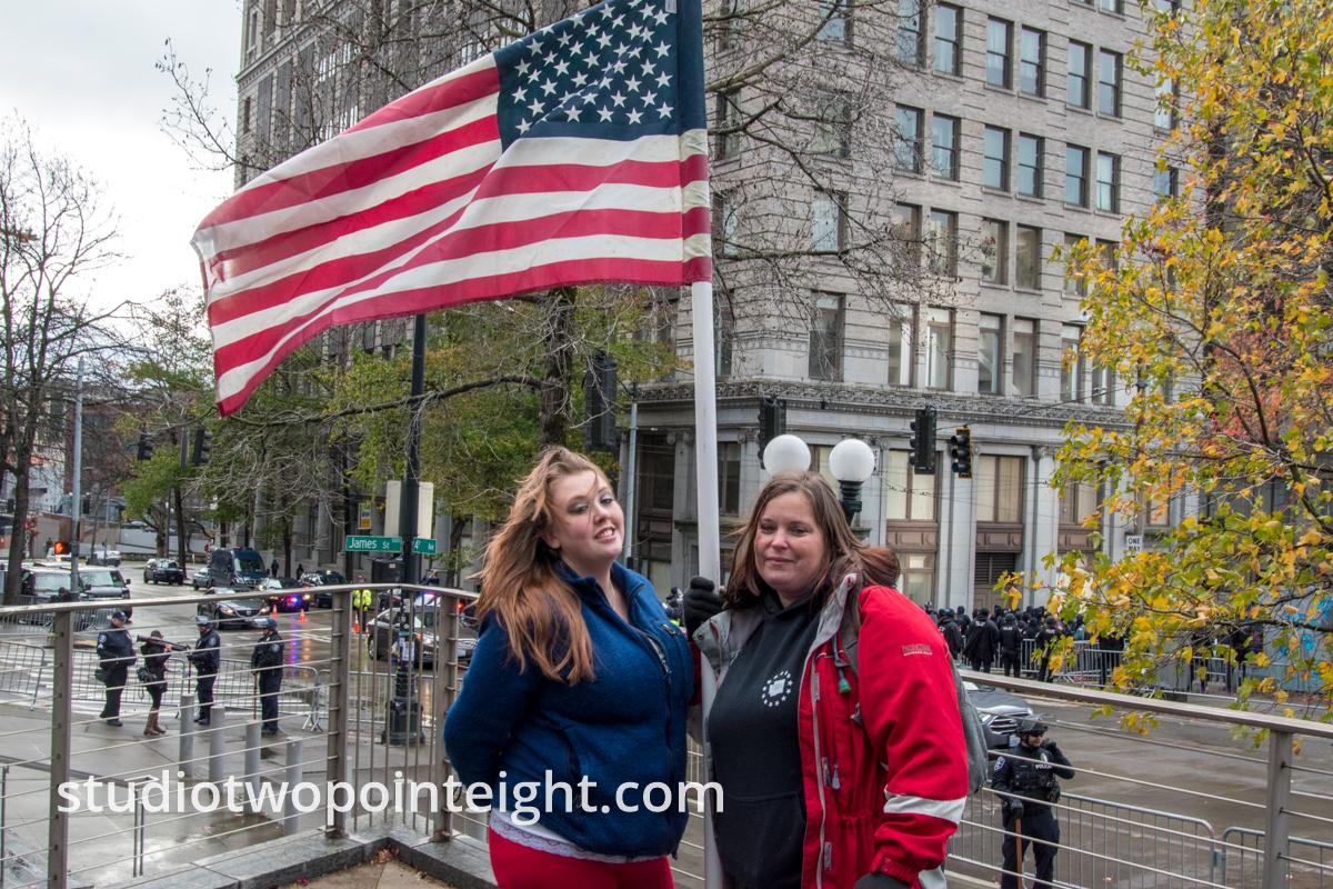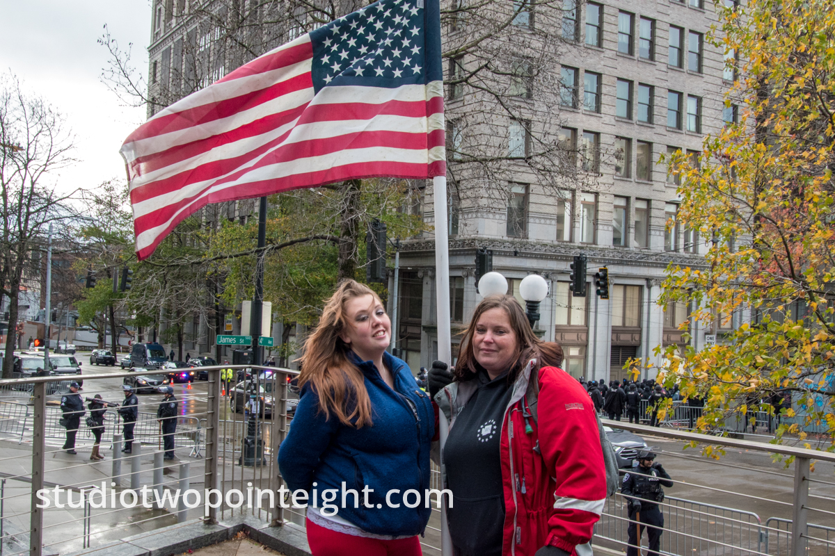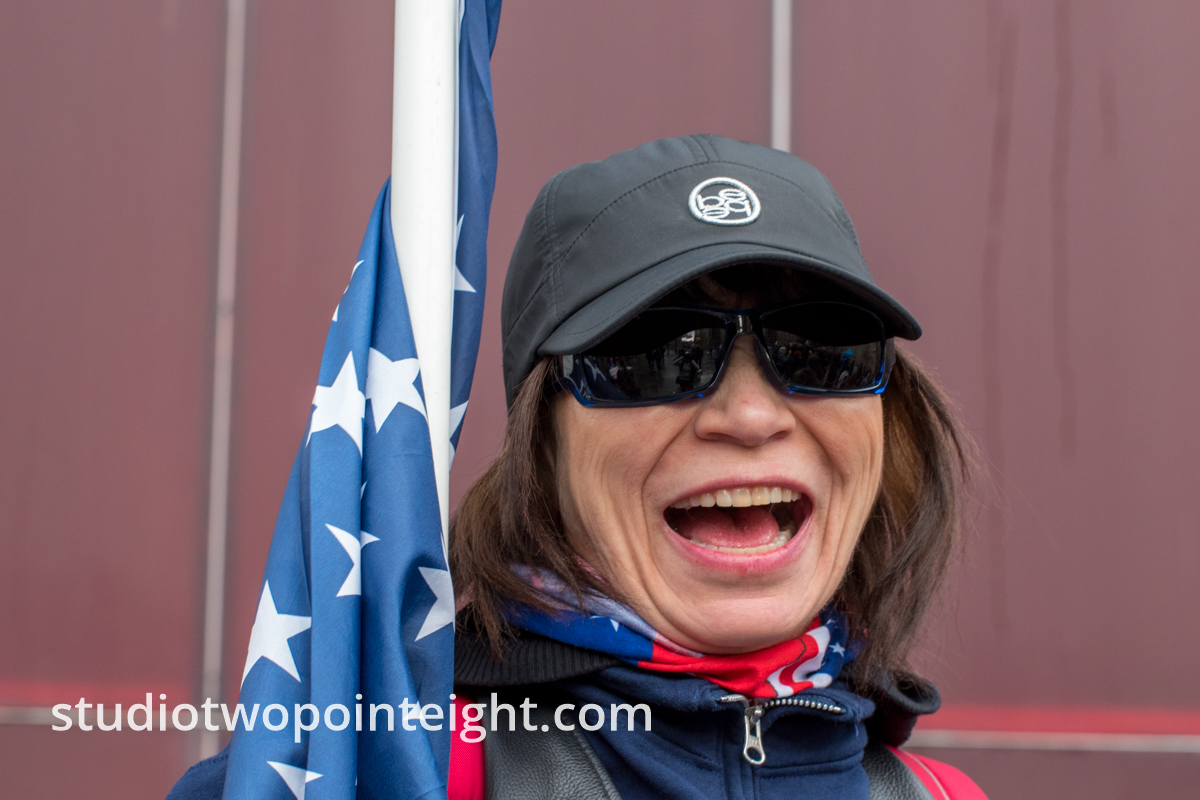 The photos in this Studio 2.8 photography exclusive photo gallery were produced in downtown Seattle, Washington on Sunday January 5, 2020 at the Seattle City Hall plaza/courtyard where a non-profit political organization called the Washington Three Percent held a rally with speeches entitled "United Against Hate". In this Studio 2.8 exclusive photo gallery, rally attendees carried and displayed various types of political, and patriotic, flags. This Studio 2.8 photo gallery contains photographs of attendees who carried: American stars and stripes flags, a "PATRIOTS UNITED Against Communism" flag, a "Don't Tread on Me" gun rights flag, a "Trump 2020" flag, a "We Support Our Troops" flag, and more.