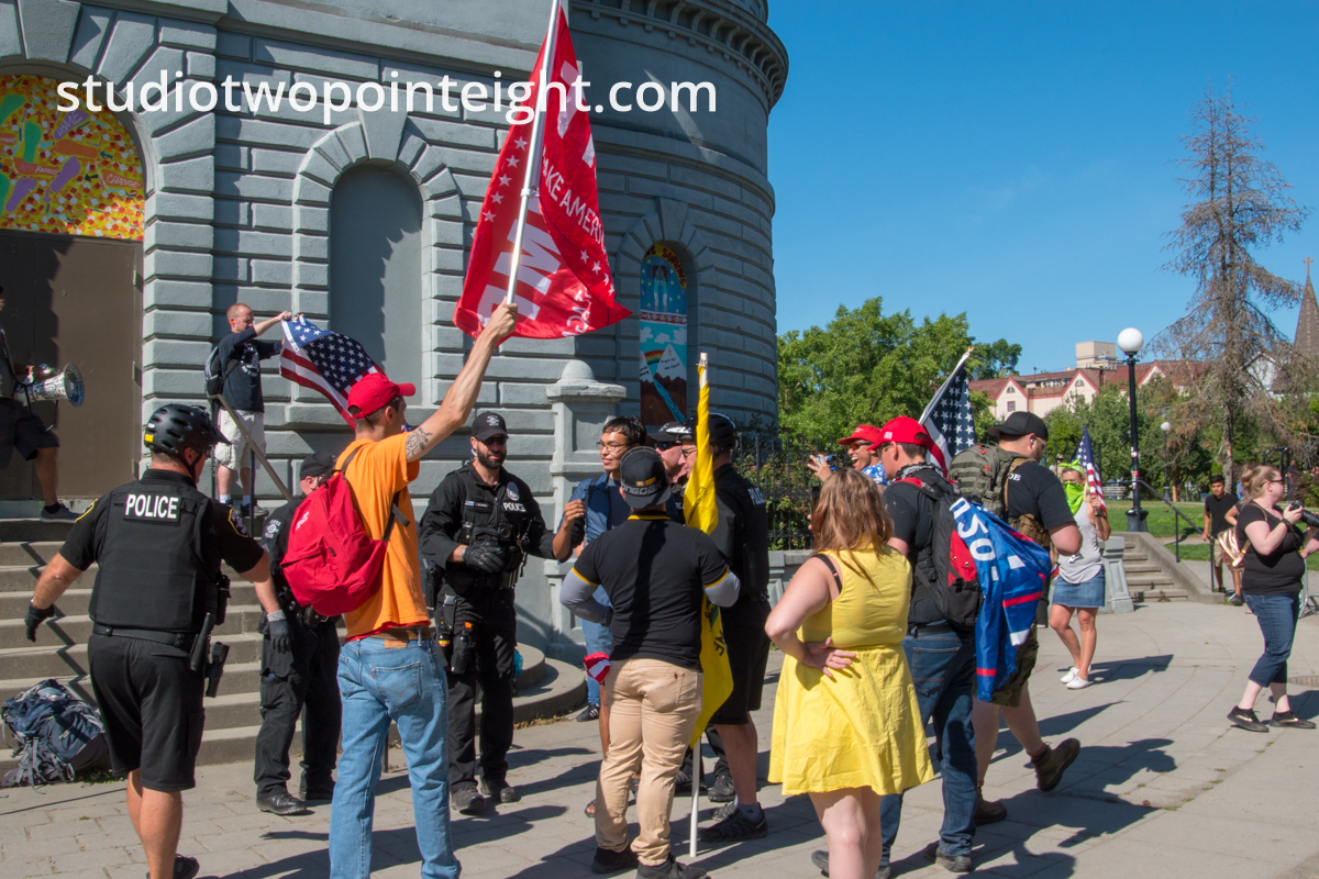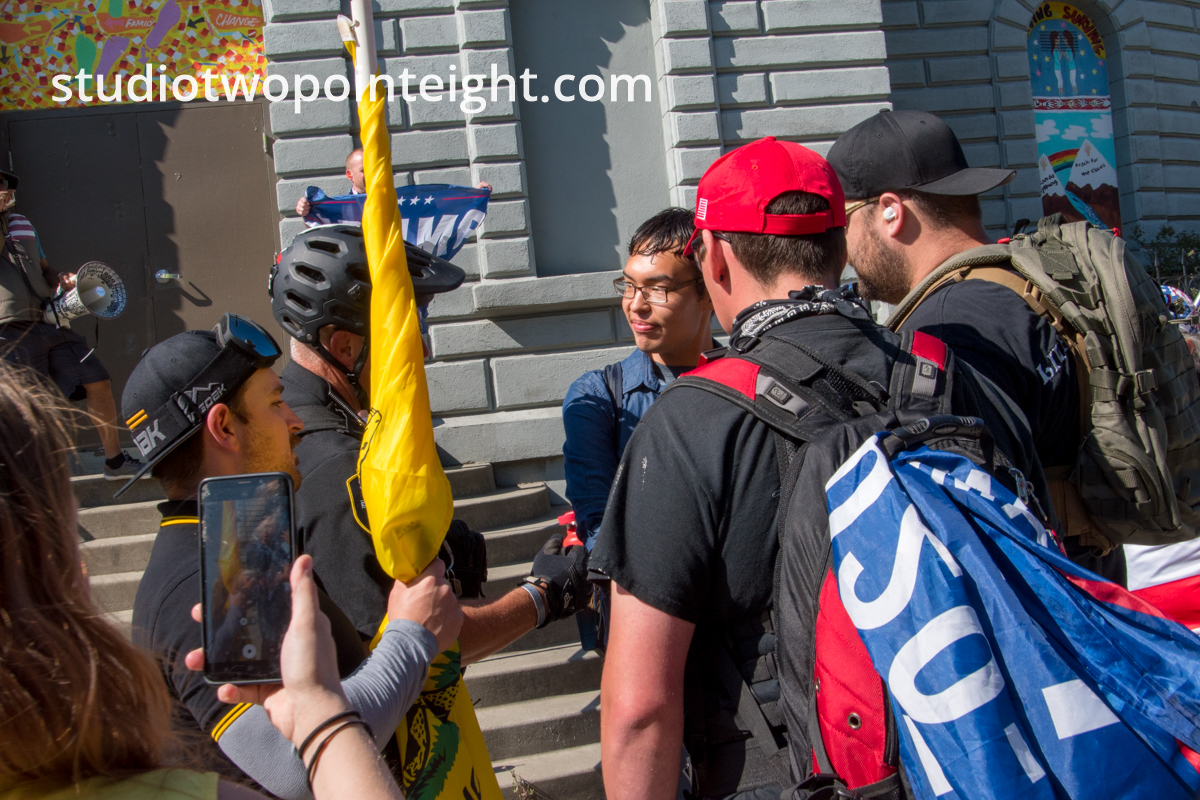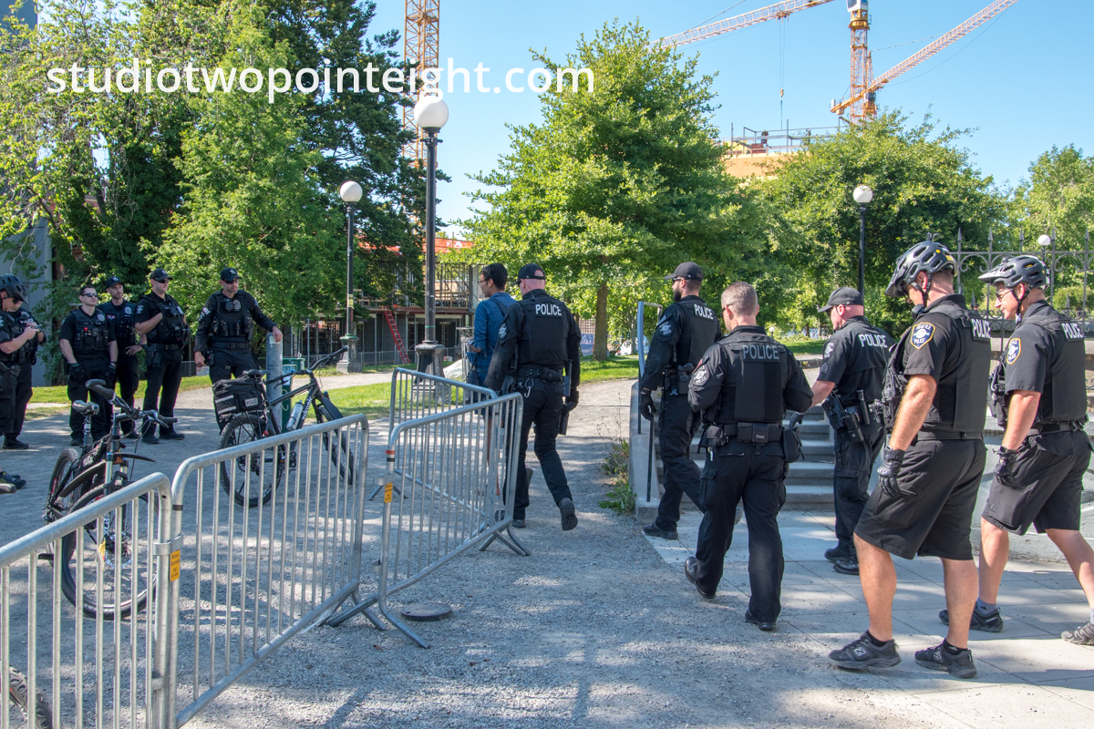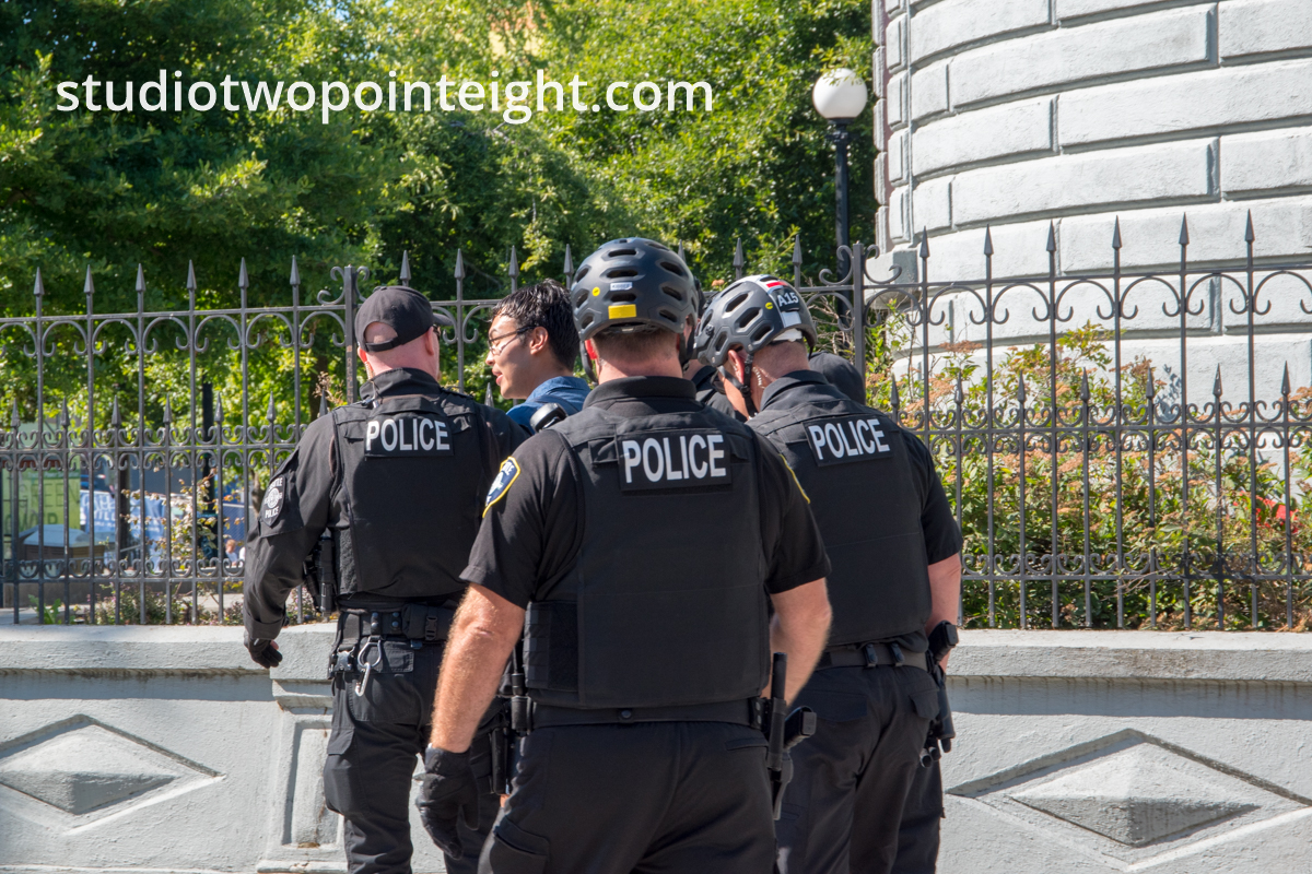 In this Studio 2.8 photography photo gallery, a series of Studio 2.8 photographs produced on the afternoon of Sunday July 28, 2019 during a political rally and march held at Seattle's Cal Anderson Park in the Capitol Hill neighborhood of Seattle, Washington Seattle Police Department officers arrested and detained an Asian man after the Asian man assaulted one of the rally speakers, Katie Daviscourt, then entered the barricaded area and confronted people among the speaking group and refused to leave the area, all while the Asian man maintained a bizarre and quite surrealistic, socially inappropriate, smile on his face.