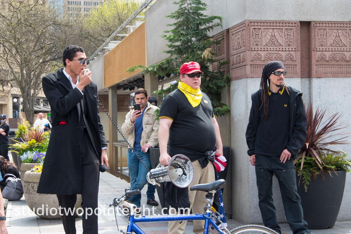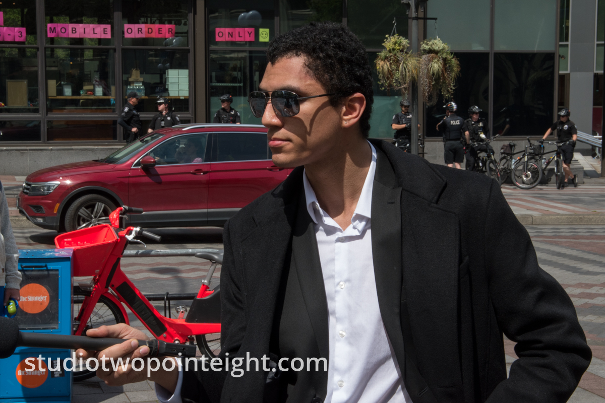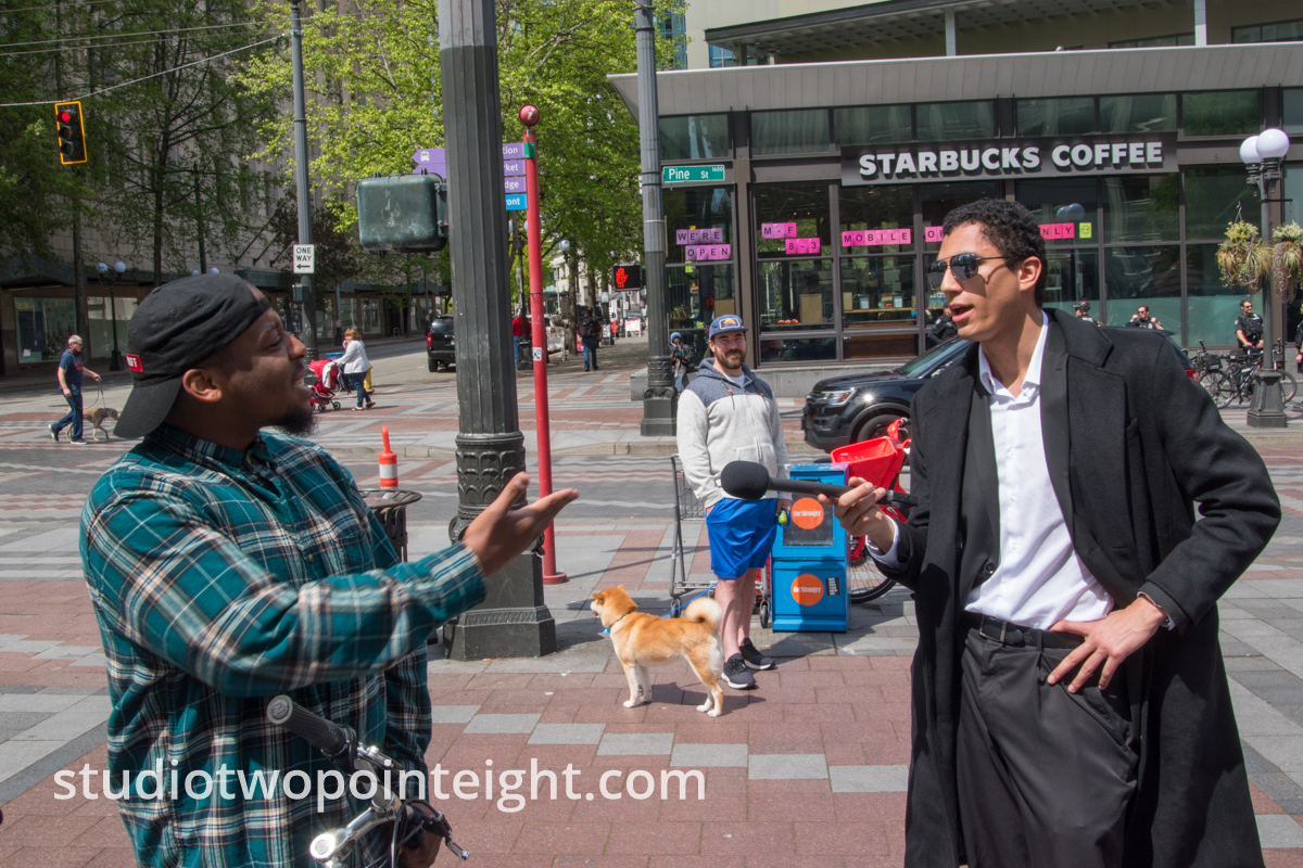 In this Studio 2.8 photography photo gallery, produced in downtown Seattle, Washington at Seattle's Westlake Park on Friday May 1, 2020 during a May Day "End The Lockdown" political rally and march, is one of the event organizers, local African American Republican activist and youtube political commentator Dion Thompson. African American youtube channel host Dion Thompson is pictured in this gallery of Studio 2.8 photographs at various moments during the rally and march, as he interviewed people, and expressed his political opinion in opposition to Washington State Governor Jay Inslee's statewide business shutdown and "stay at home" order.