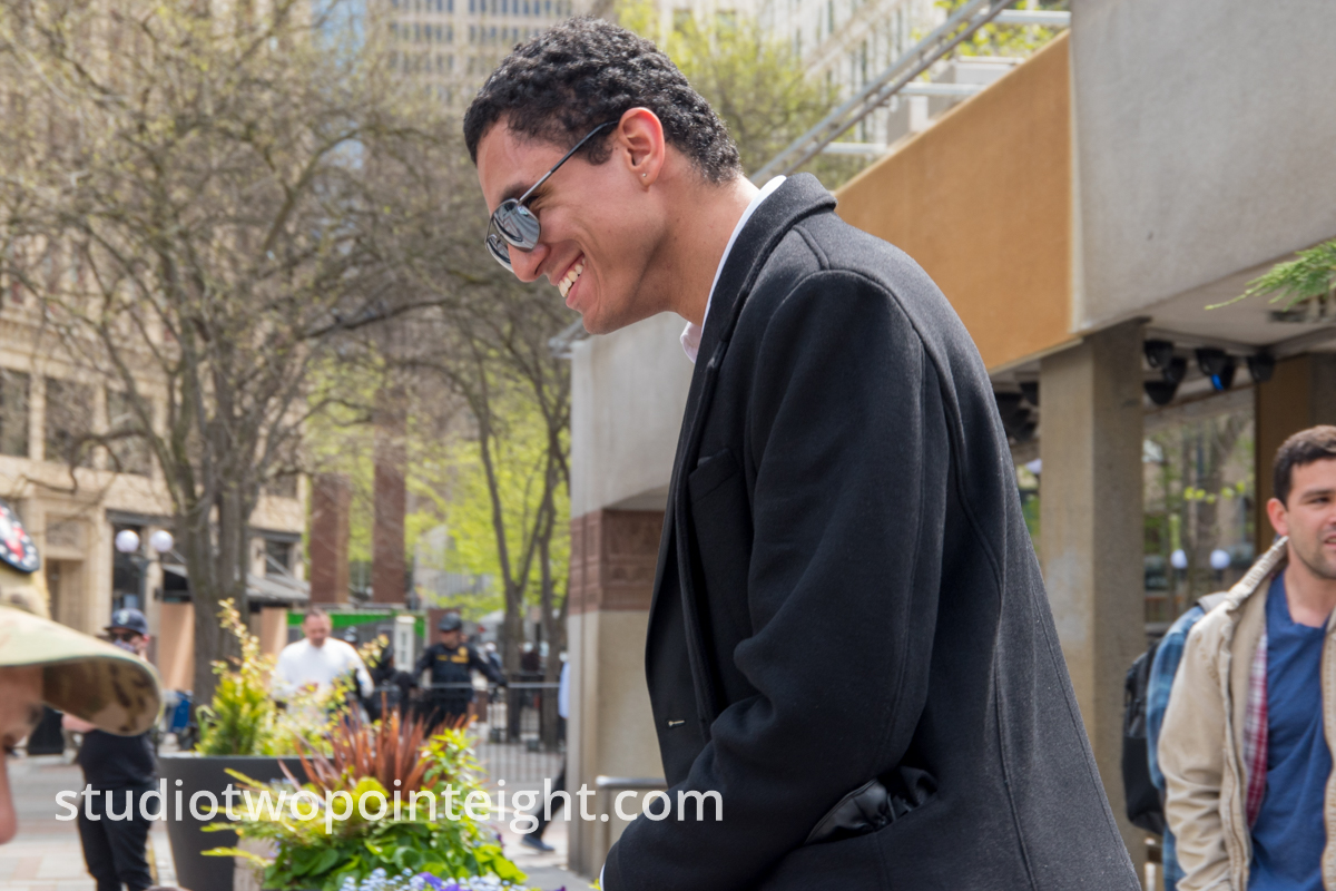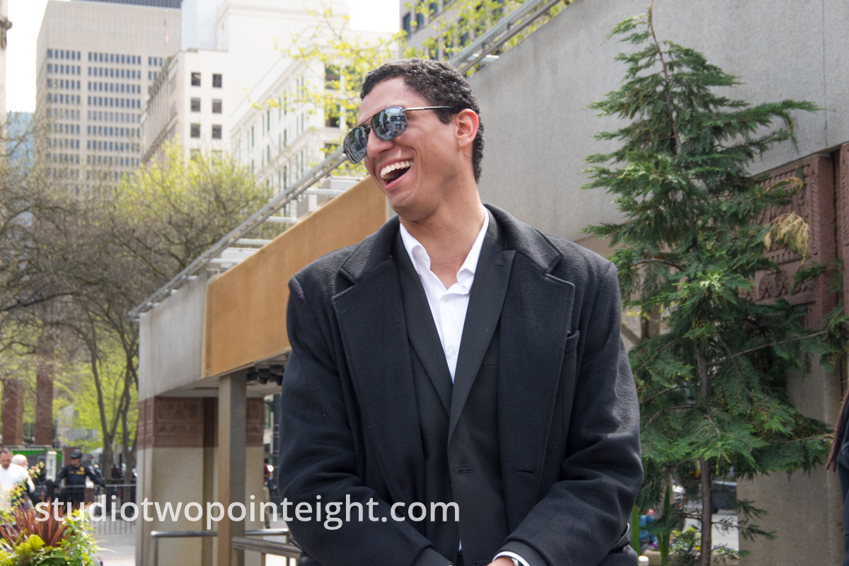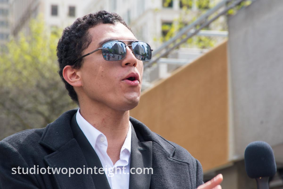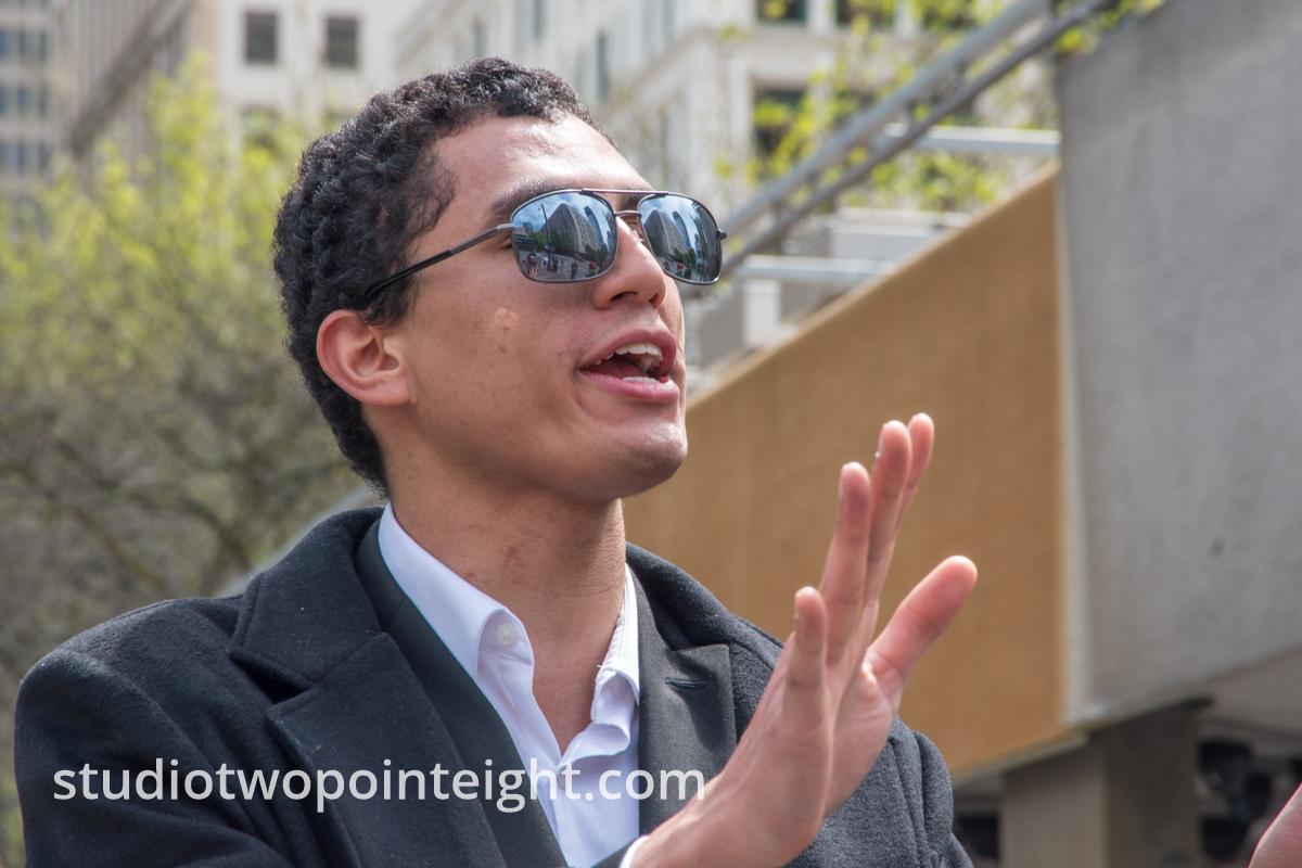 In this Studio 2.8 photography photo gallery, produced in downtown Seattle, Washington at Seattle's Westlake Park on Friday May 1, 2020 during a May Day "End The Lockdown" political rally and march, is one of the event organizers, local African American Republican activist and youtube political commentator Dion Thompson. African American youtube channel host Dion Thompson is pictured in this gallery of Studio 2.8 photographs at various moments during the rally and march, as he interviewed people, and expressed his political opinion in opposition to Washington State Governor Jay Inslee's statewide business shutdown and "stay at home" order.