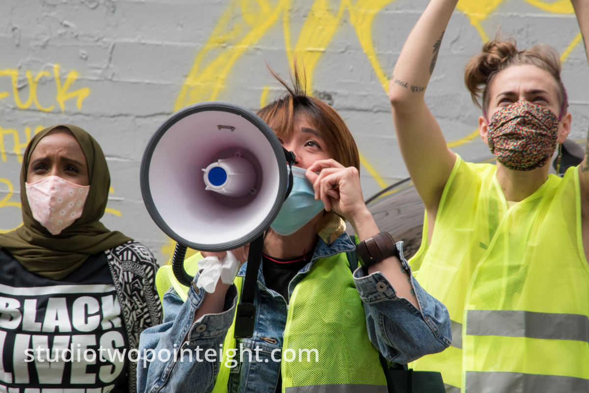 This Studio 2.8 photography photograph of several Rent Strike demonstrators was produced in downtown Seattle on Friday May 1, 2020 as the demonstrators returned to their vehicles after they had demonstrated at the amazon spheres outside the amazon.com headquarters. In this Studio 2.8 photograph the demonstrators used an amplified bullhorn to converse with some Seattle apartment dwellers who looked on from their apartment windows at the parking lot where the Rent Strike demonstrators had congregated. The demonstrators had been demonstrating in favor of a Rent Strike due to the economic hardships many people have experienced as a consequence of the government coronavirus protection "stay at home" order that had been in effect since March 2020 in Washington State.