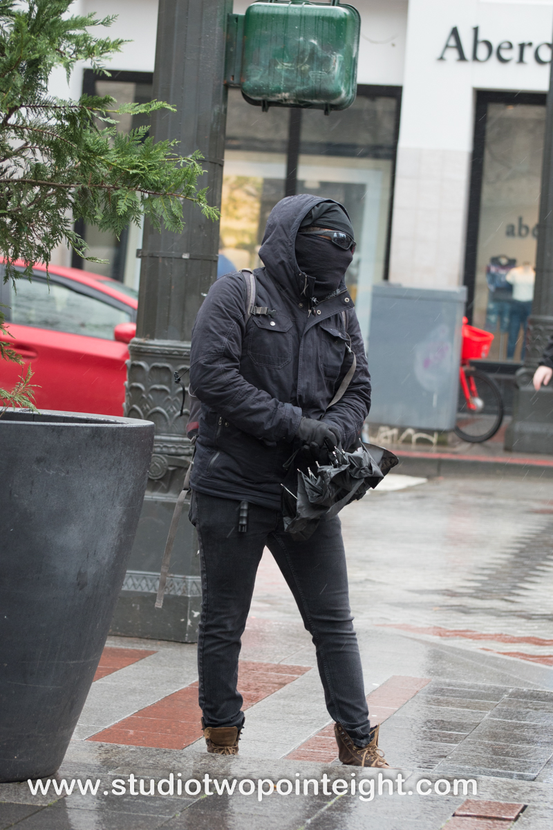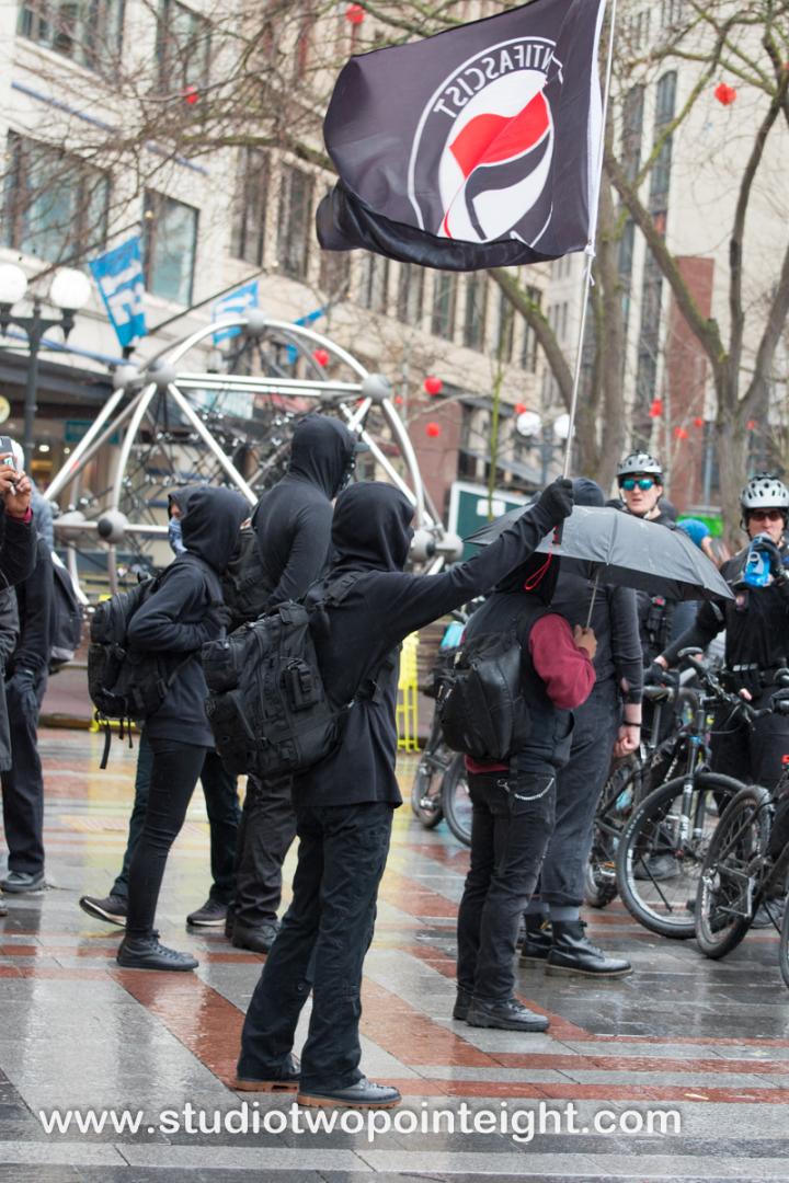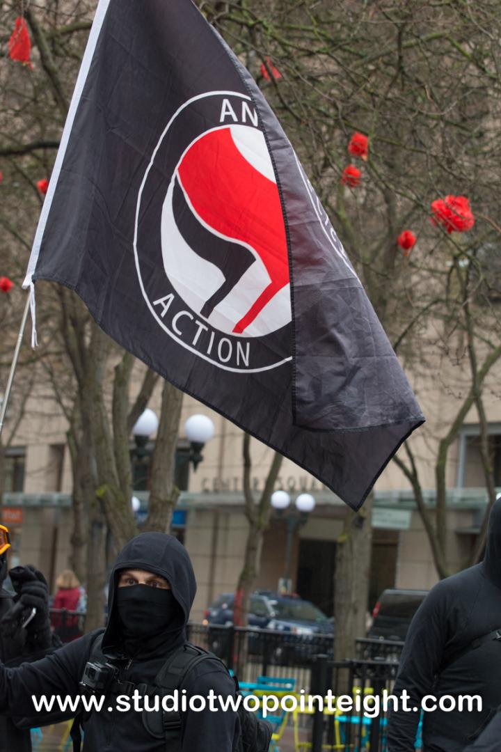 This Studio 2.8 photography photo gallery was produced in downtown Seattle's Westlake Park on President's Day 2020, February 15, 2020. In this gallery of Studio 2.8 photography photographs, various participants in the Puget Sound region's anarcho-communist domestic terror cell network brandished their anarchist battle flag and tried to intimidate and harass a group of Seattle area Republicans who had gathered in Westlake Park to commemorate and celebrate 2020's President's Day holiday.
