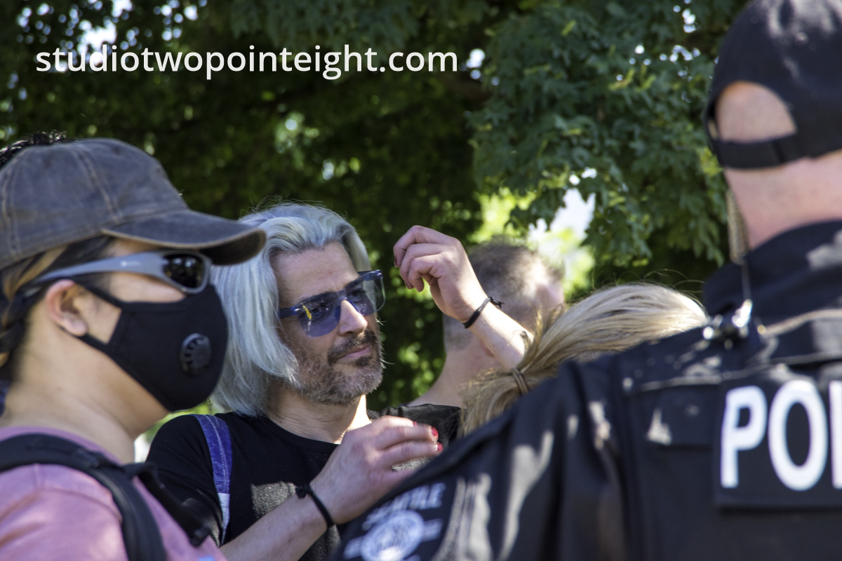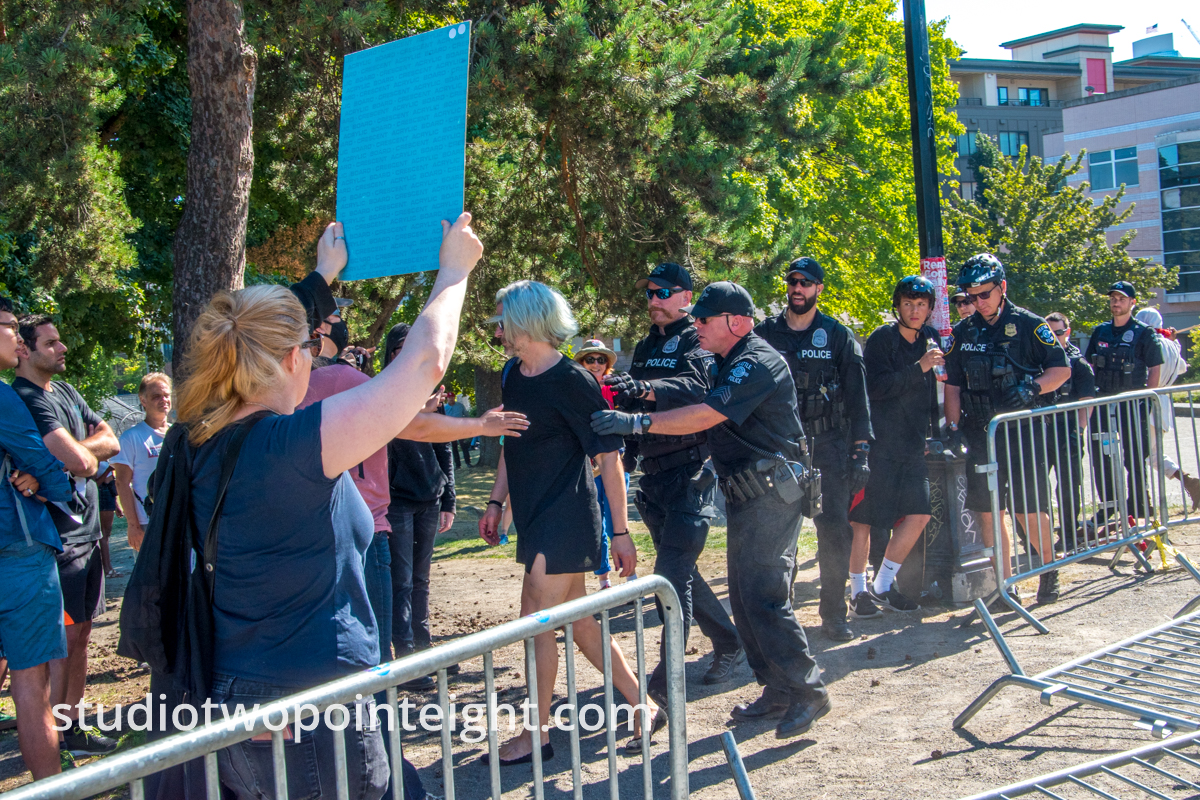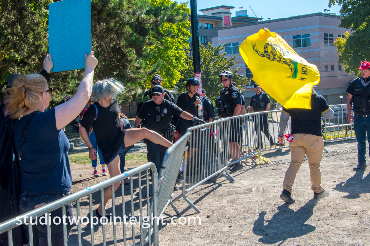 Studio 2.8 at Political Rally and Counter Protest in Seattle's Cal Anderson Park where a Dress Wearing Male Protester Kicked A Metal Police Barricade