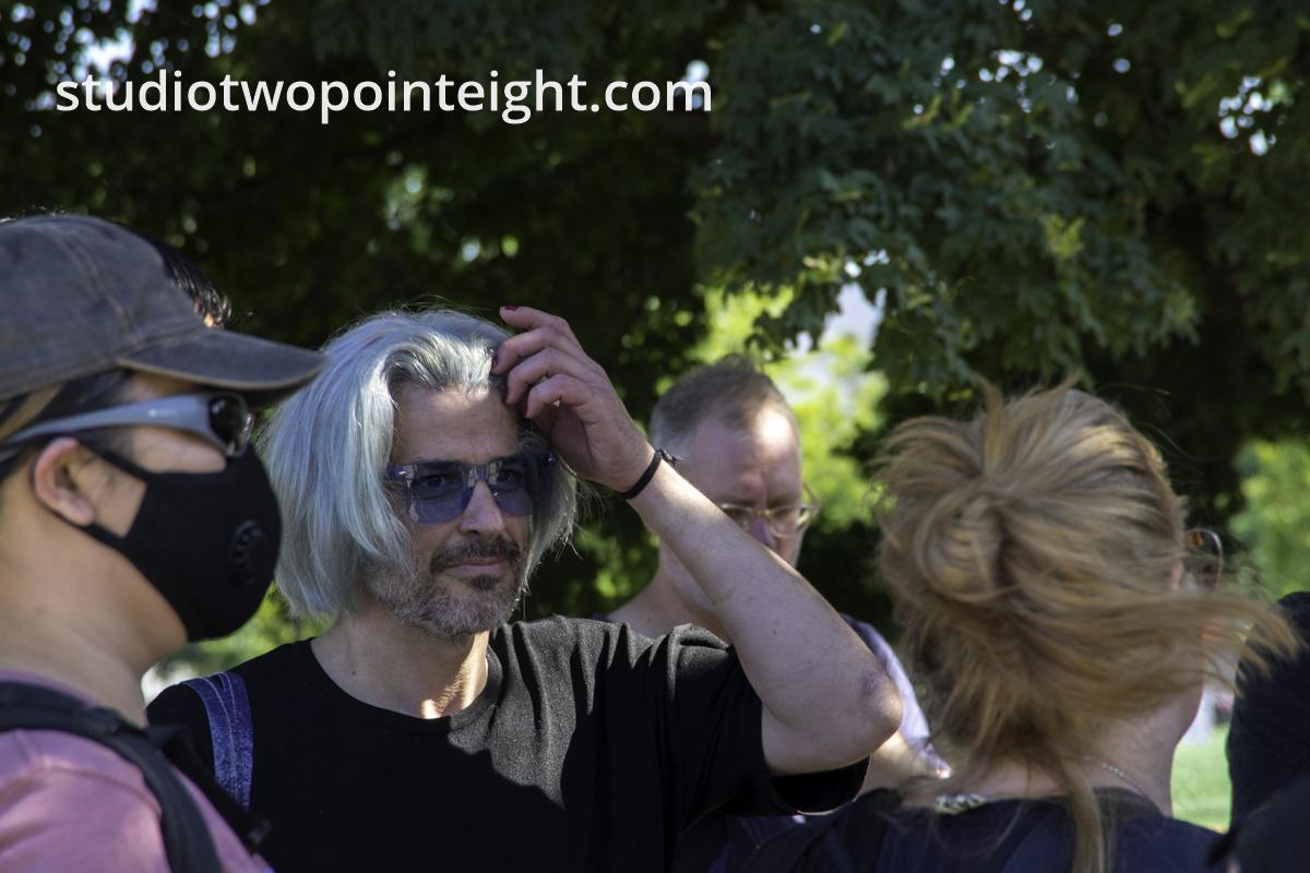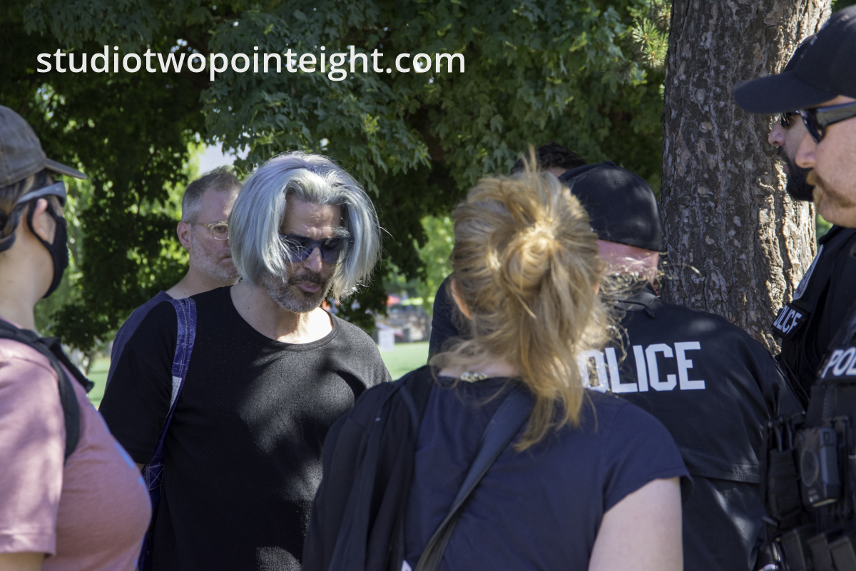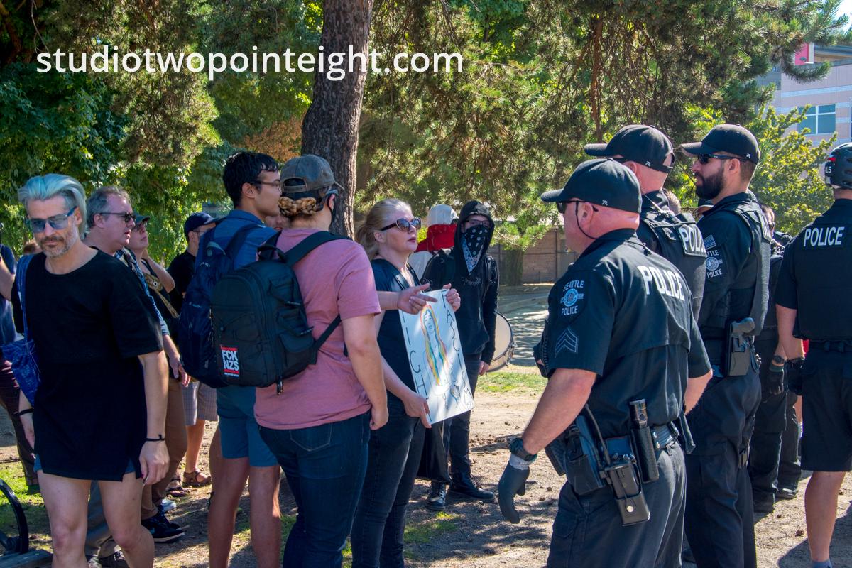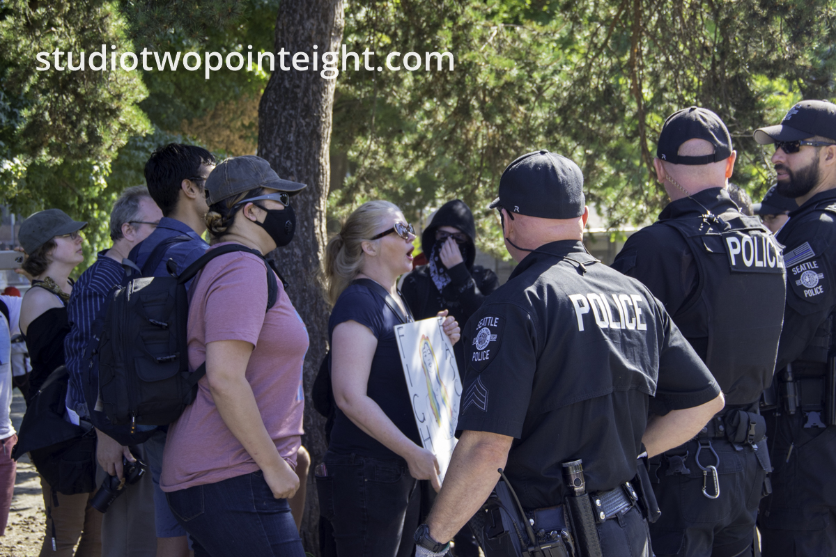 Studio 2.8 at Political Rally and Counter Protest in Seattle's Cal Anderson Park where a Dress Wearing Male Protester Kicked A Metal Police Barricade