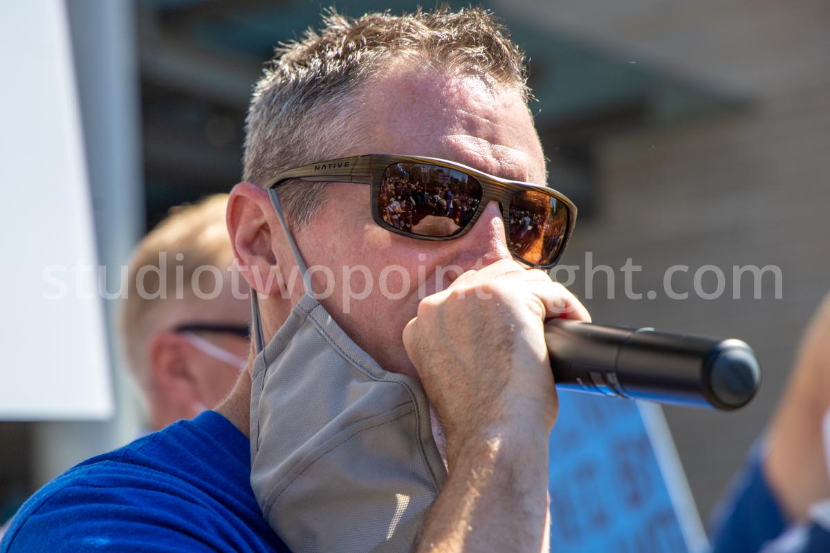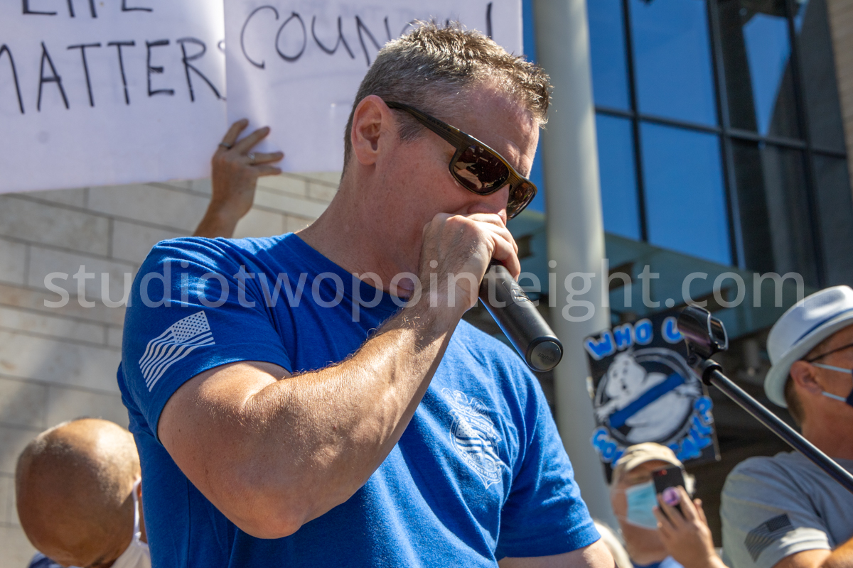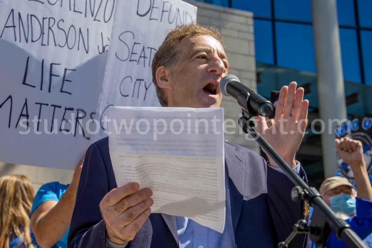 The Studio 2.8 photography super gallery of photographs above presents selected photographs from photos produced by Studio 2.8 Photography on Sunday August 9, 2020 in Seattle at a political rally and demonstration entitled "Stop Defunding SPD". The August 9, 2020, political rally was organized by the Seattle Police Officers Guild, and other supporters of the Seattle Police Department who do not want the Seattle Police "defunded" by the Seattle City Council and Seattle Mayor Jenny Durkan. This political rally, held on the Seattle City Hall courtyard along 4th Avenue in downtown Seattle, was attended about over 1,000, and possibly as many as 2,000, political demonstrators, a crowd so large that it overflowed onto the large Seattle City Hall grand exterior staircase. The speakers at this political rally included Seattle Police Officers Guild president Mike Solan, KIRO Radio host Jason Rantz, and University of Washington meteorologist Cliff mass.