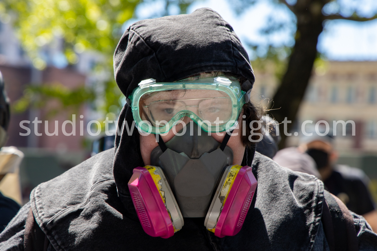 The political demonstration held by the Seattle Police Officers Guild in Seattle on August 9, 2020 was also attended by a much smaller group of counter protesters. Many of the counter-protestors appear wearing disguising clothing in a style known as "Black bloc", to try to help them hide their identities.