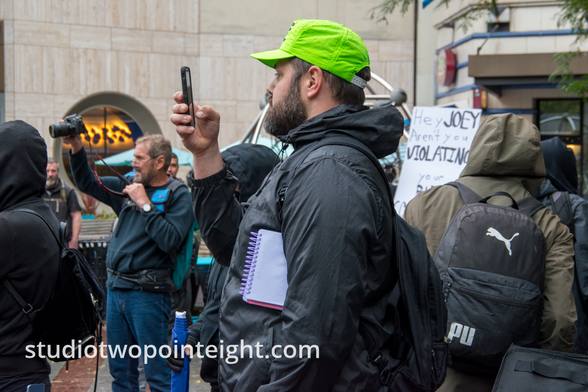 This gallery of Studio 2.8 photography photographs was produced on Sunday September 29, 2019 at Westlake Park in the heart of downtown Seattle, Washington, where a group of Seattle Republicans had organized and held a political rally and march that day. A group of Seattle area anarcho-communists counter-protested the event, including participants in the Seattle area anarcho-communist domestic terror cell network known as the "Antifa Black Bloc" (sic).