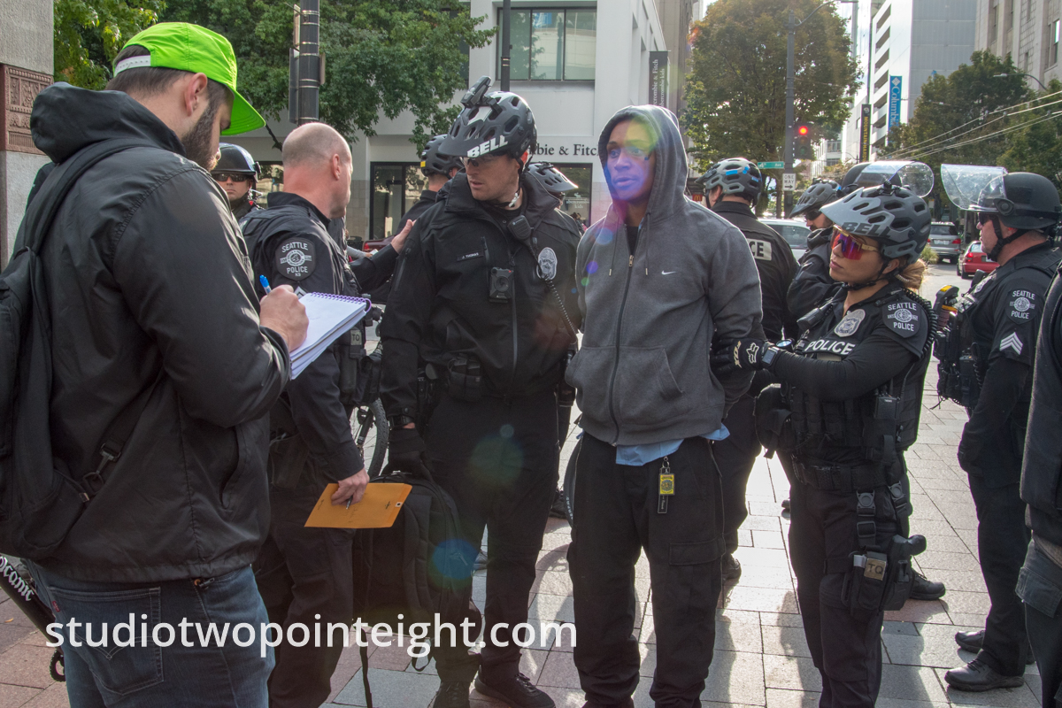 In the last photograph within this gallery of Studio 2.8 photographs, produced as the event attendees had completed their rally speeches and were leaving to march through the Seattle streets, one of the National Lawyer's Guild observers obtained and wrote down information from counter-protester Christian Rene Bossett, to try to later help bail Bossett out of the King County Jail. A group of Seattle Police Department bicycle officers had arrested Bossett because Bossett had tried to push through one of the police department's bicycle officer barricades.