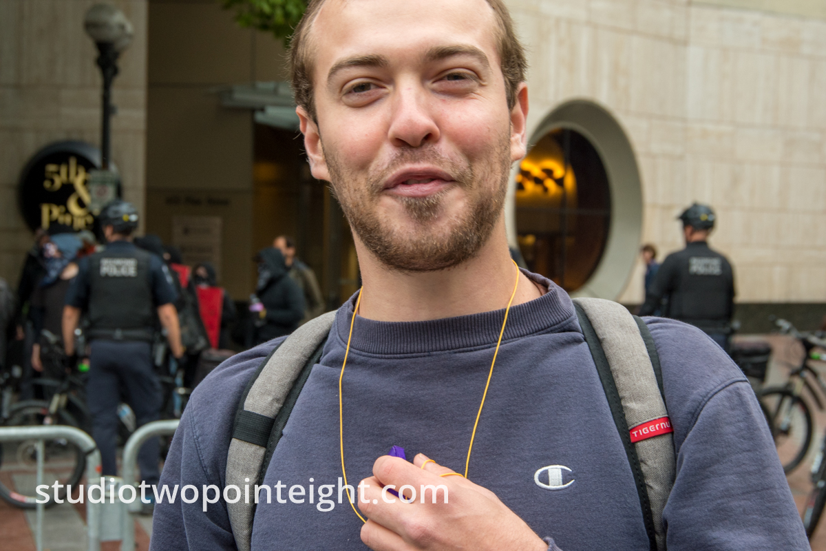 This Studio 2.8 photography photograph, and its associated GoPro action cam shoulder mount perspective video clip, was produced on Sunday September 29, 2019 at downtown Seattle's Westlake Park where a scant three counter-protesters occupied the official counter-protest area setup by the Seattle Police Department for their use. The confused and immature counter-protester in this Studio 2.8 photography had misguidedly convinced himself that Studio 2.8 works for a political media group called InfoWars. The InfoWars political media group is not one of Studio 2.8's various photography licensing clients.