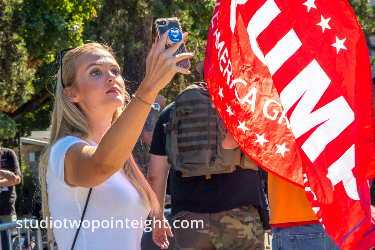 On Sunday July 28, 2019, Studio 2.8 photography and videography covered a political rally, march, and counter-protest held at Seattle's Cal Anderson Park, in the Capitol Hill neighborhood of Seattle, Washington. The group of Seattle area Republicans who organized the political rally named their Sunday July 28, 2019 event "Seattle Liberty March". Some of the event organizers and speakers live streamed video of their event via internet social media, which is what the woman in the Studio 2.8 photograph is doing, talking to her internet social media audience while showing counter-protesters in the background of her live internet presentation.