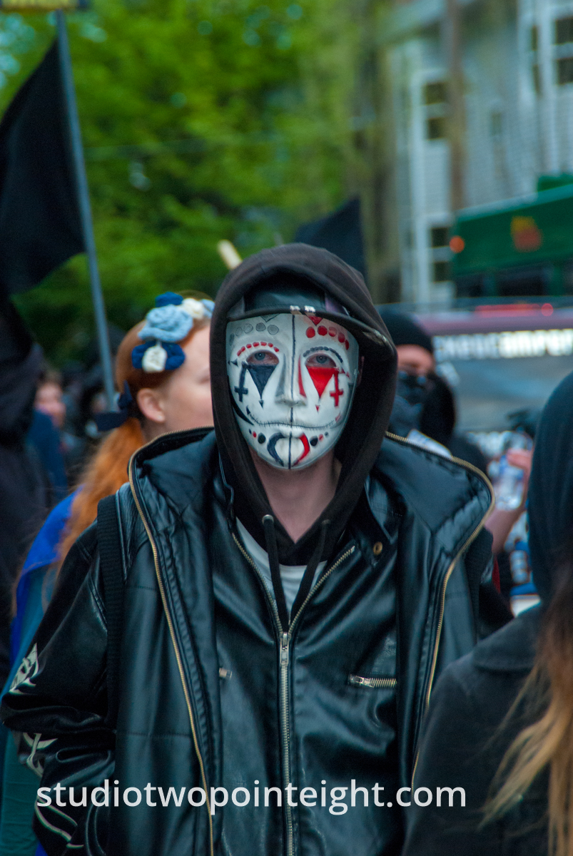 Studio 2.8, During Seattle Liberty March, A Masked and Goggled Anarcho-Communist Counter-Protester Posted For A Telephoto Lens Portrait