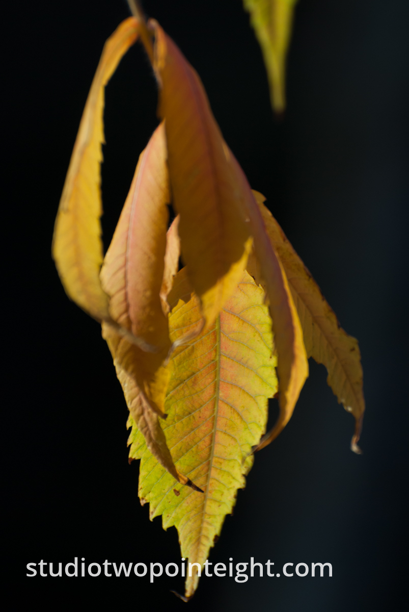 An Autumnal Assay - Asymmetrical Green and Brown Leaves Against Bokeh Blue Sky