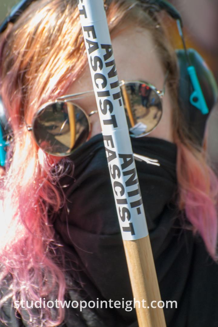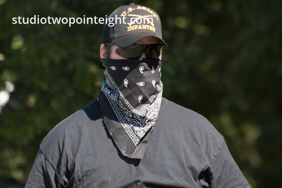 Studio 2.8, During Seattle Liberty March, A Masked and Goggled Anarcho-Communist Counter-Protester Posted For A Telephoto Lens Portrait