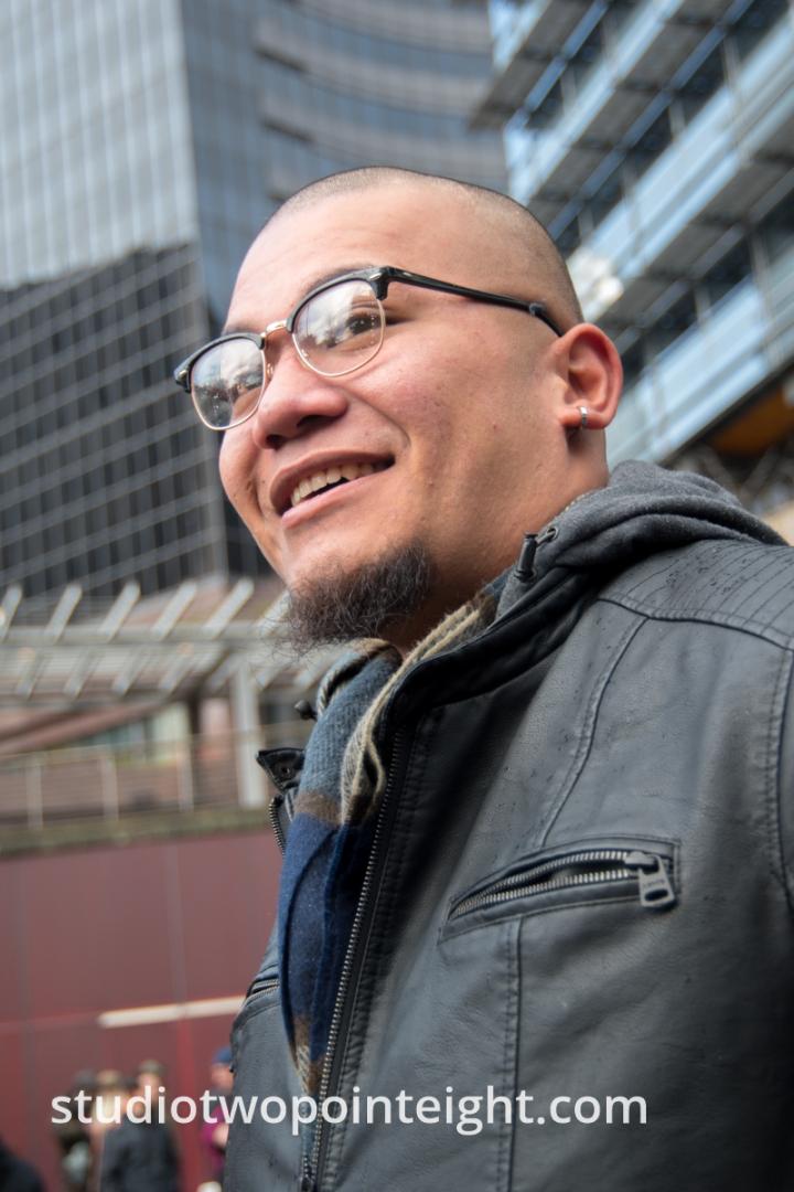The Studio 2.8 Photography photo above was produced on December 1, 2018 in downtown Seattle at a political rally and counter-protest entitled "Liberty or Death 2". As seems standard fare at political rallies and protests these days, among the people who counter protested the "Liberty or Death 2" rally held on December 1, 2018 in Seattle by the Washington Three Percent, was a counter protester with an amplified bullhorn. The amplified bullhorn wielding counter protester used it for multiple purposes.