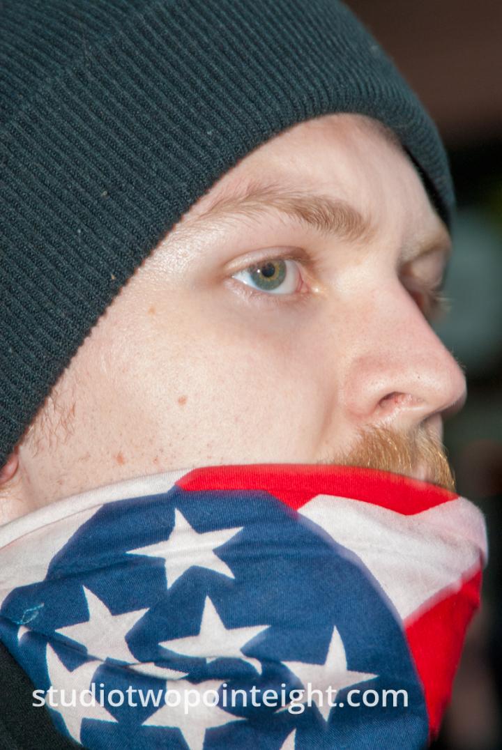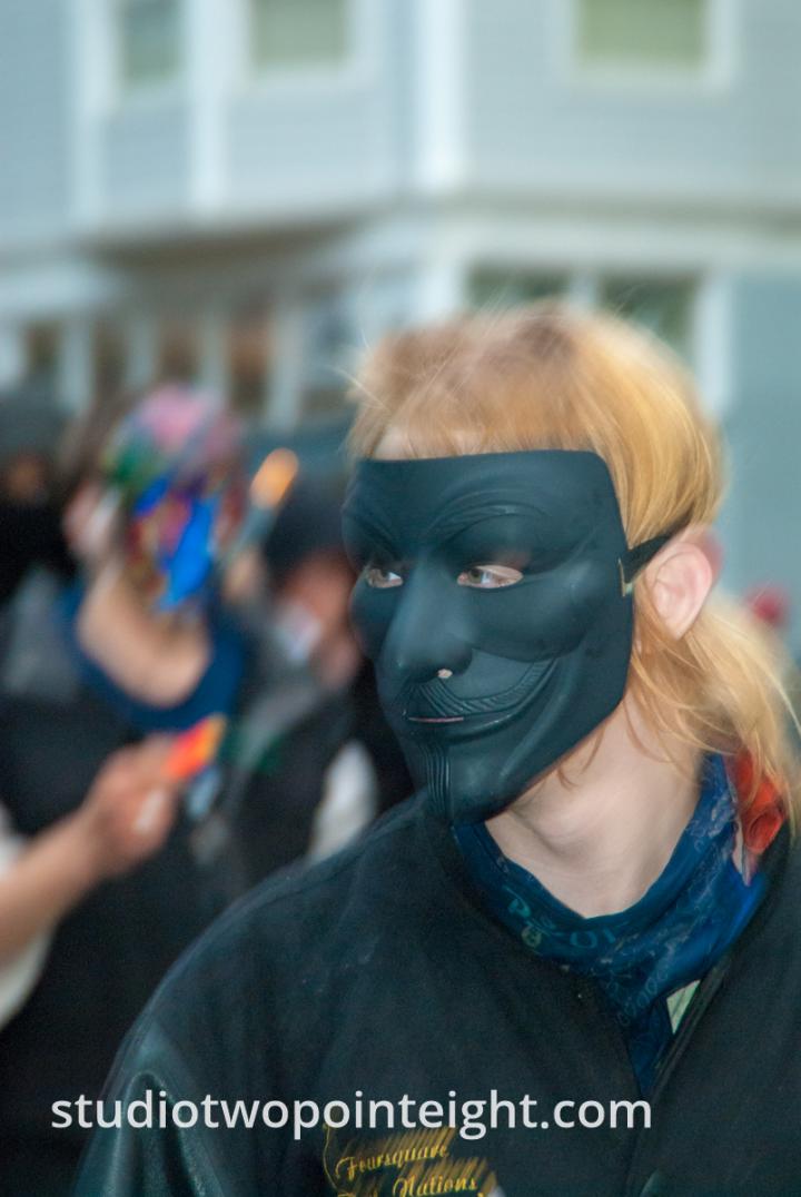 In this photograph from May 1, 2015 in Seattle, captured during that year's May Day Anarchist / Block Bloc protest and street mayhem, a large crowd of mostly masked Black Bloc "anarchists" jeered at the Seattle Police as they marched through the streets of the Capitol Hill neighbordhood's western slope Pike Street and Pine Street corridors. Ironically, a number of the Black Bloc were in various states of "bandanna malfunction" with their faces exposed and their bandanna's down around their necks.