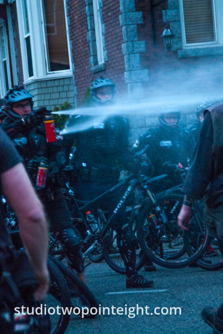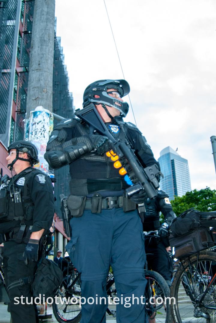 In this photograph from May 1, 2015 in Seattle, captured near dusk during that year's May Day Anarchist / Block Bloc protest and city street mayhem, a large group of Seattle Police officers formed a bicycle barricade across Olive Way just east of the Olive Way bridge over the Interstate-5 expressway, where Olive Way crosses into downtown Seattle. Moments after this photograph was taken, Seattle Police opened fire onto the large crowd of "Anarchist", mostly masked "Black Bloc" protesters, with sonic stun grenades and so called "blast ball" grenades.